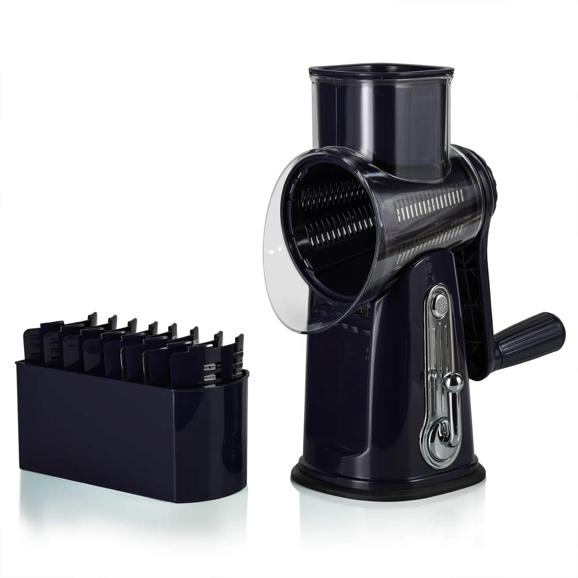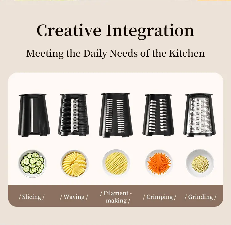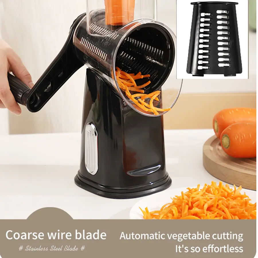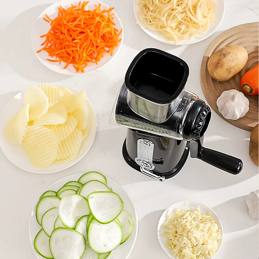 Elevate your kitchen with this Rotary Cheese Grater. It features 5 well-designed blades for efficient grating. Perfect for cheese, vegetables, and fruits. The strong suction cup base ensures stability during use. Ideal for slicing and dicing tasks. A versatile kitchen utensil that simplifies food preparation.