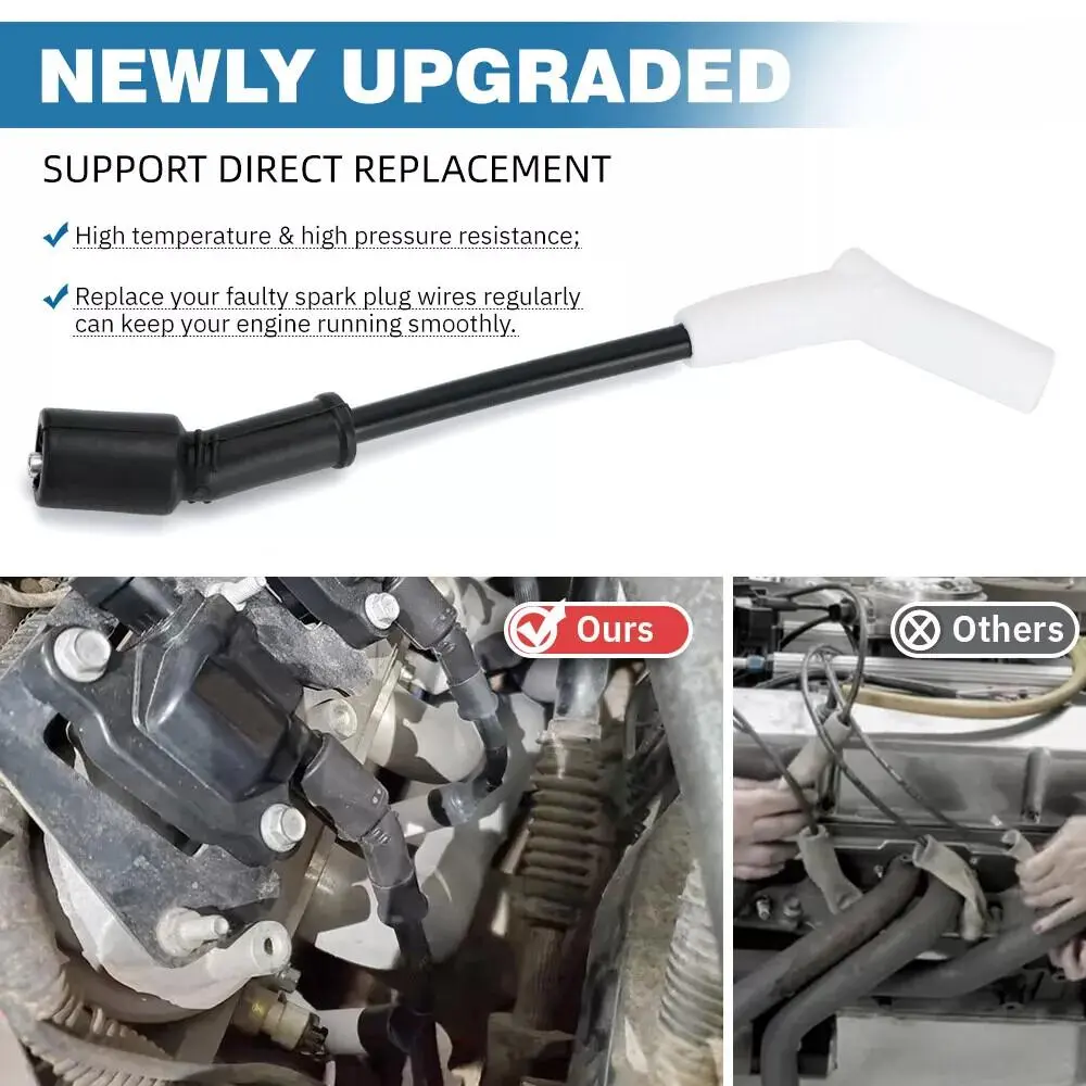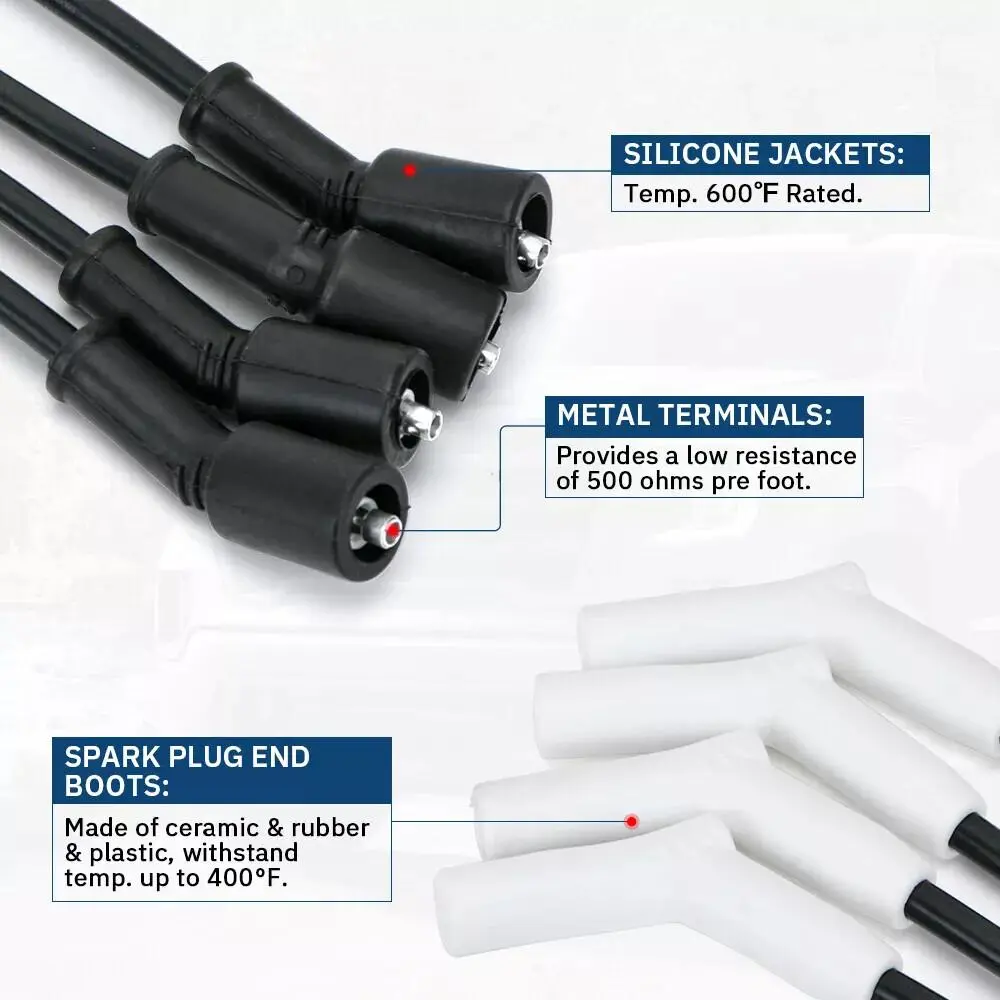 The spark plug end of the wire is made of ceramic, rubber, and plastic, using heat-resistant materials that can withstand temperatures up to 400° F to ensure that the wire can withstand extreme conditions without degradation or causing electrical problems.