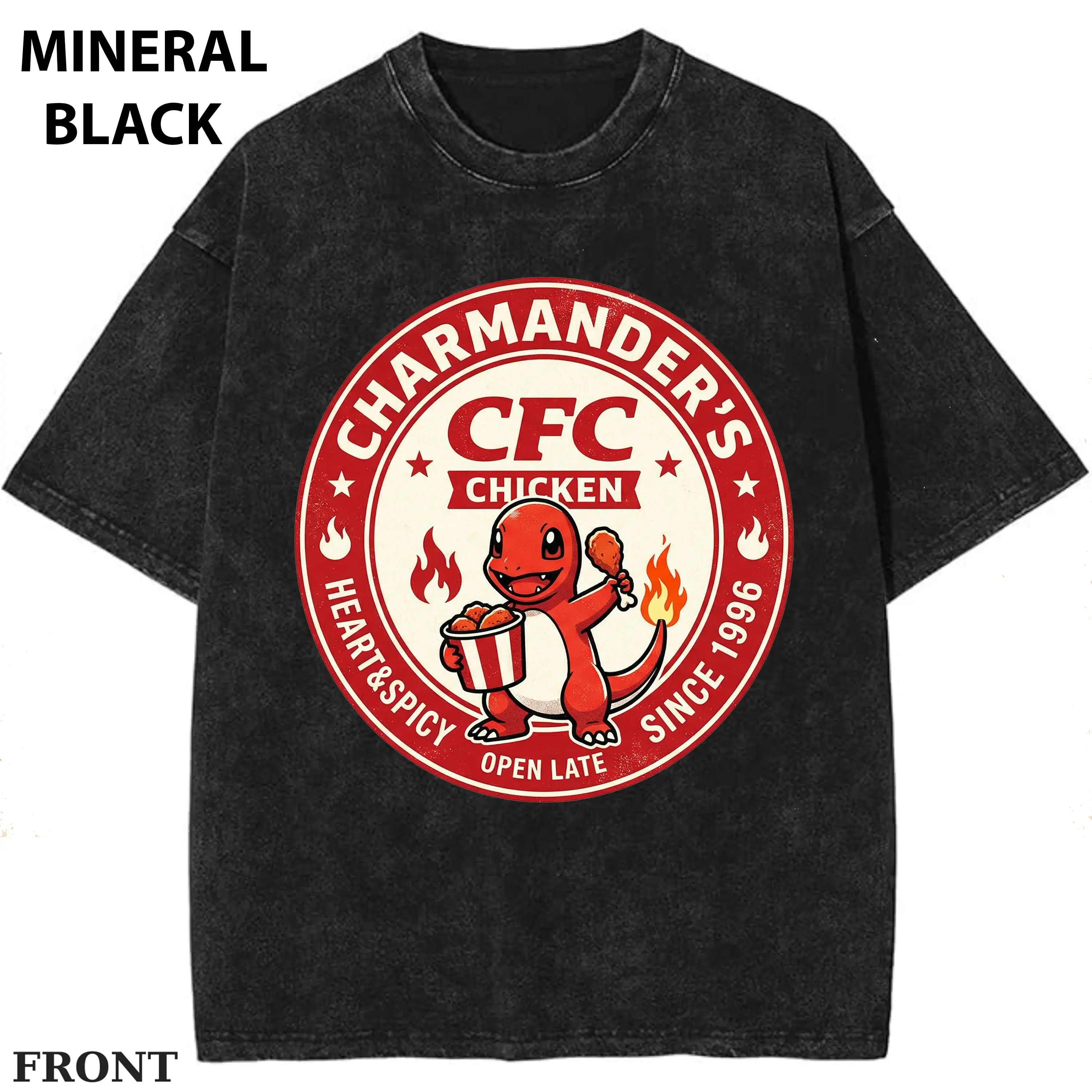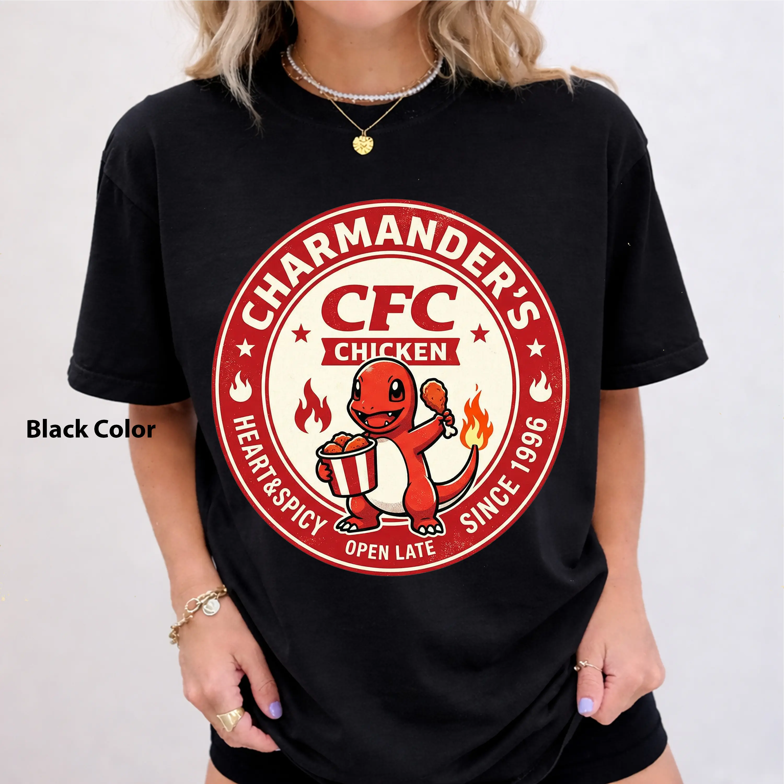 CFC Pokebon Chicken Shirt, Funny Fire Lizard Chicken Shirt, Spicy Fast Food Parody Tee, Cute Cartoon Food Graphic T-Shirt, Anime Inspired Streetwear Shirt, Kawaii Food Lover Tee, Retro Logo Style Humor Shirt Womenswear Top