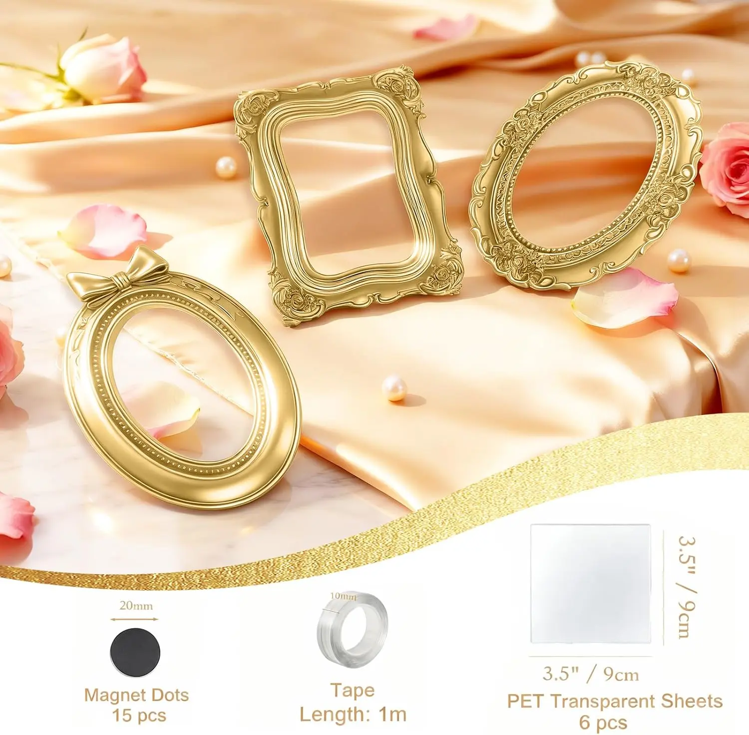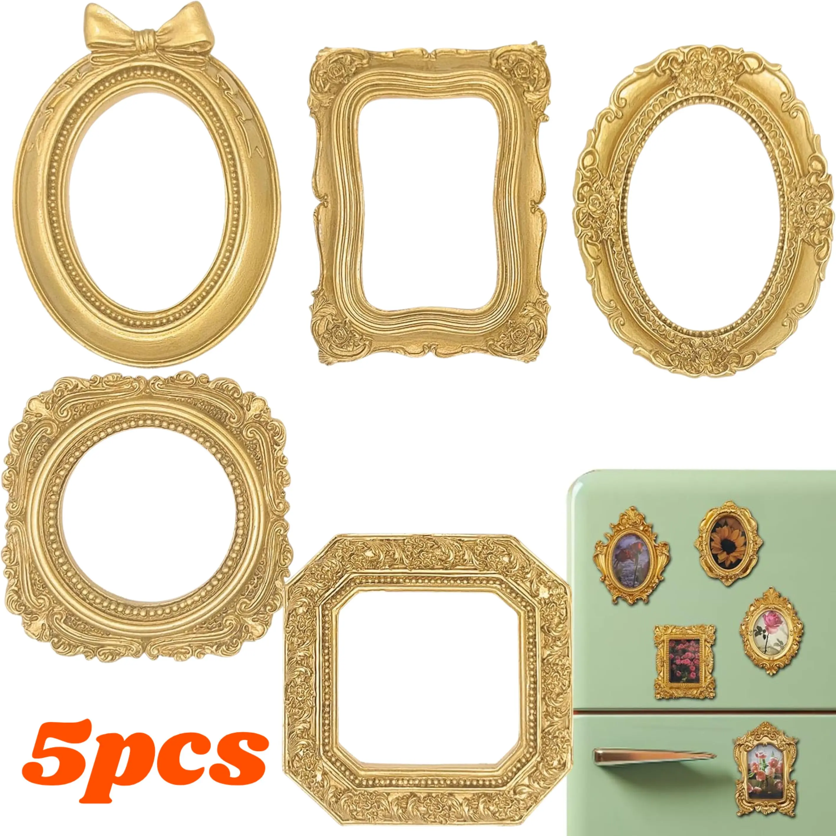 Package Including: 5pcs vintage frames in different shapes and sizes and adhesive tapeMagnetic stickersProtective sheet.