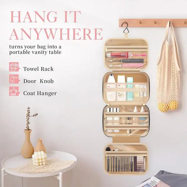 ·STURDY HOOK DESIGN: Featuring a premium metal hook, the HOTOR cosmetic travel bag offers the convenience of hanging from a towel rack, coat hook, or any available space. This not only showcases your toiletries and cosmetics for easy accessibility but also saves valuable bathroom counter space. The sturdy metal hook is designed with a retractable feature, allowing it to be neatly stowed away when not in use.