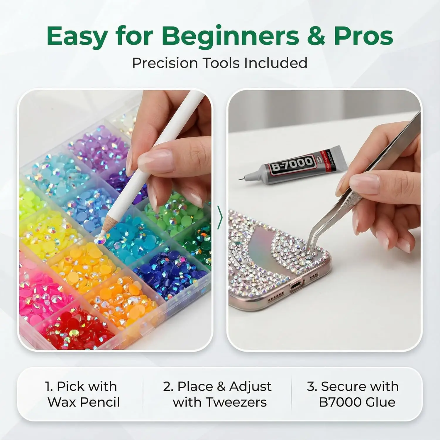 ·【Wide Applications】The rhinestone and glue can permanently adhere a variety of materials, perfect for jewelry making, nails art, metal, glass, rubber, paper, ceramics, wood, leather, household uses and other crafts repair purposes