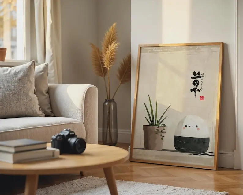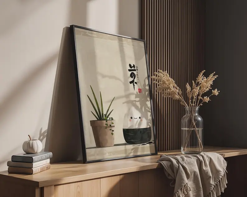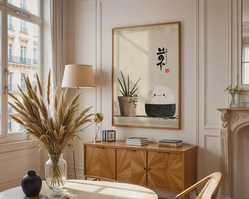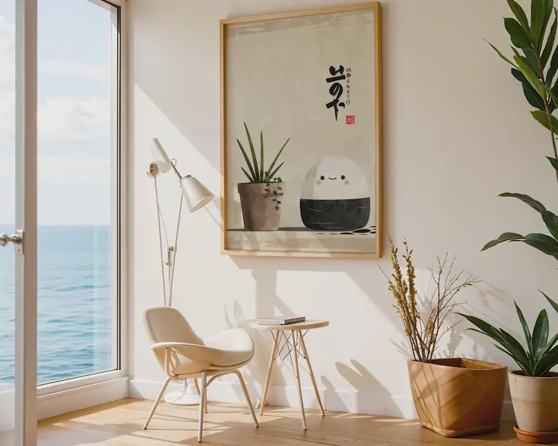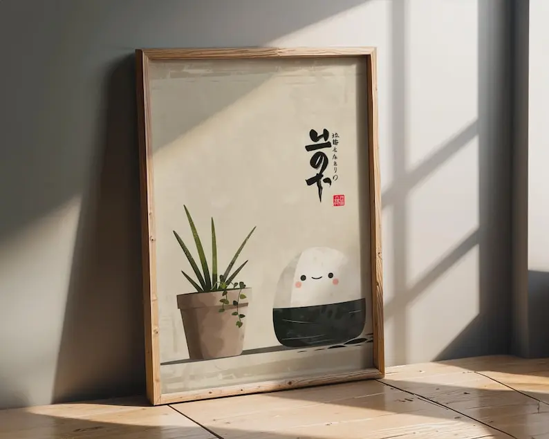 Kawaii Onigiri Wall Art, Japanese Minimalist Print, Beige Kitchen Decor with Green Plant