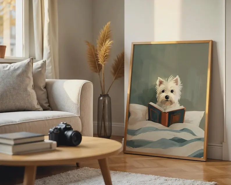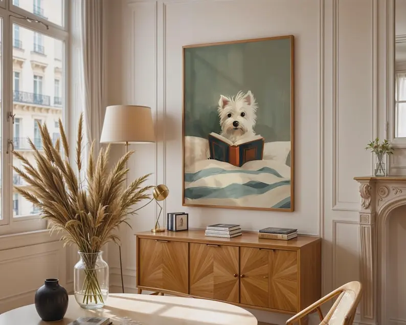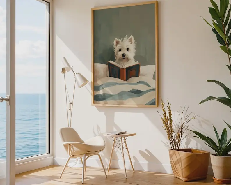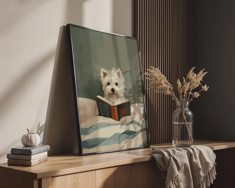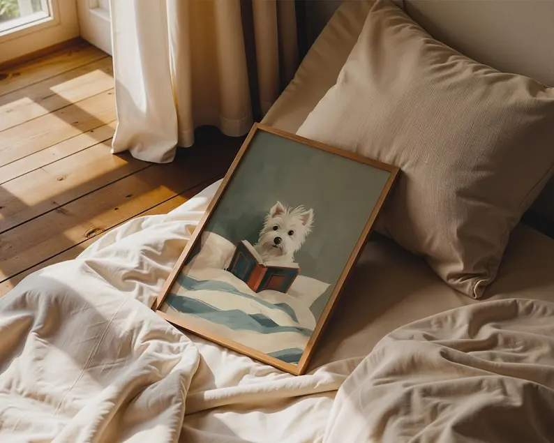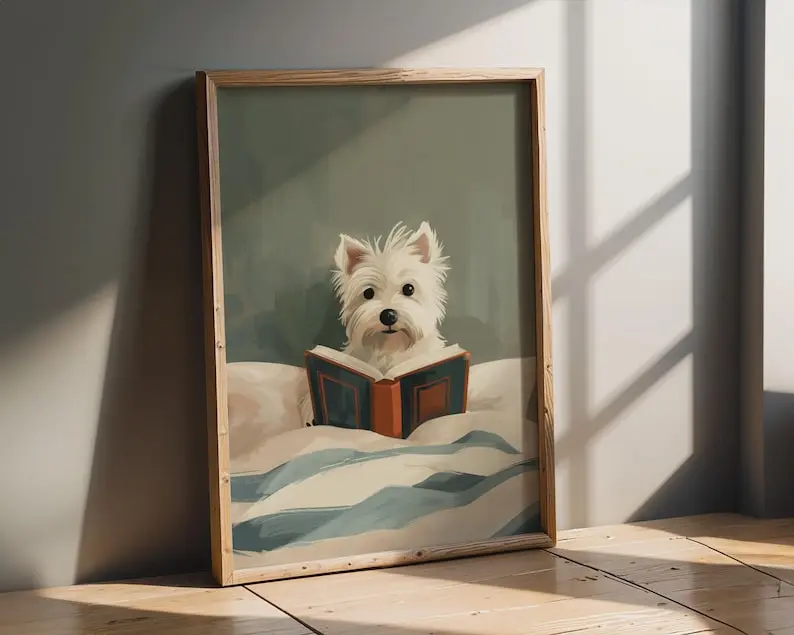 5. Westie Dog Reading Book Print, Whimsical Cream Teal Bedroom Decor