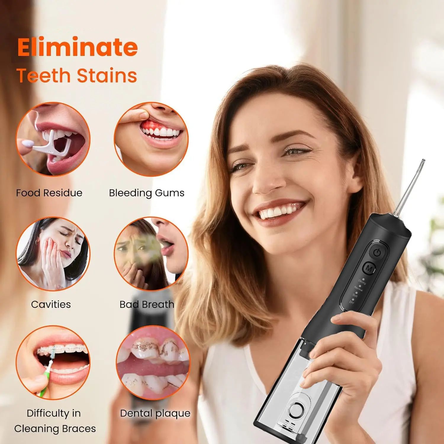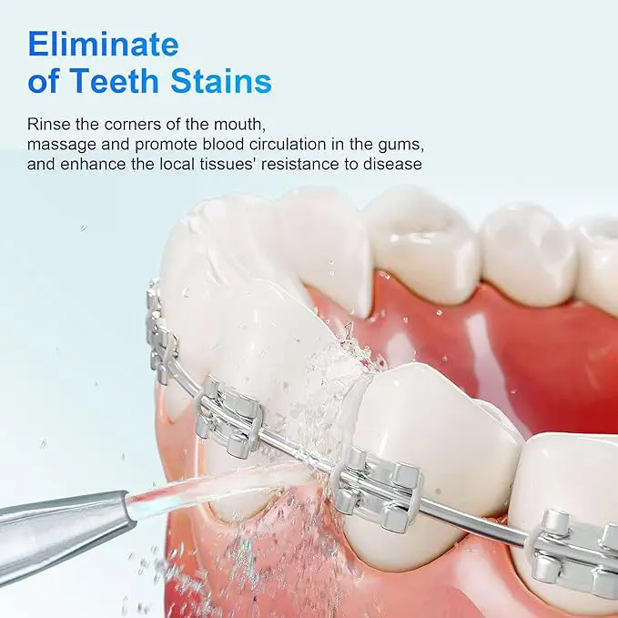 This water flosser delivers exceptional cleaning results, helping you maintain better oral health: It utilizes advanced, safe, and highly efficient water pulse technology, which has been continuously developed and optimized by our R&D team through years of research and real-world user testing. This water flosser emits 1,600–1,800 high-pressure pulses per minute, precisely targeting and removing plaque for a thorough clean. Additionally, this water flosser features multiple operating modes and pressure settings to accommodate different oral conditions and user needs.