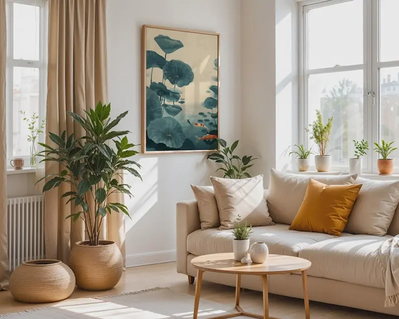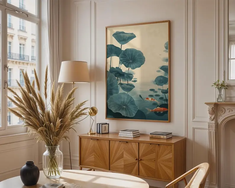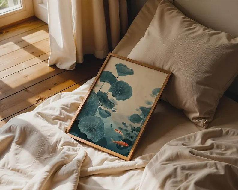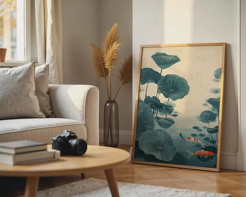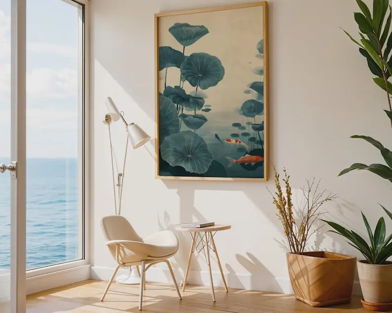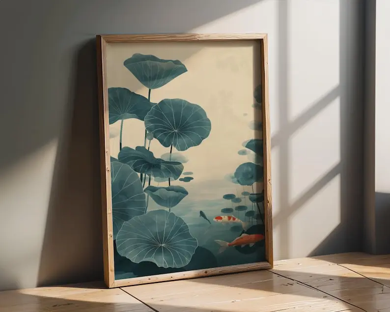 5. Koi Fish Lotus Watercolor Print, Blue Green Zen Wall Art