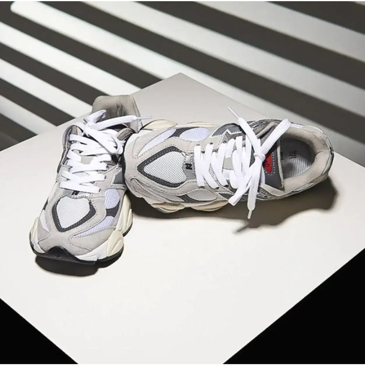 New Balance continues to innovate with models like the 9060. This "White/Grey" colorway offers a minimalist aesthetic with neutral tones. White suede and breathable mesh form the upper, complemented by a vintage-inspired midsole and laces. Grey and silver accents enhance the design, notably on the "N" logo and outsole. Experience New Balance's contemporary sneaker design.