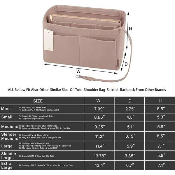 ·SIZE OF BAG ORGANIZER: Mini Purse Organizer: 7.09(W)*5.5(H)*2.75(D) inch Fits Alam BB and Fja-Kanke Mini ;onthego Pm and Montsouris BB. Small Purse Organizer: 8.66(W)*5.3(H)*4.5(D) inch Fits MJ Small Tote, Speedy 25, LC op Handle S and Book Tote New Small. Medium Purse Organizer:9.25(W)*5.9(H)*5.1(D)inch Fits 30 (Slouchy Style Preference). Slender Medium Purse Organizer: 11.2(W)*6.5(H)*3.2(D)inch Fits Graceful PM and Delightful PM
