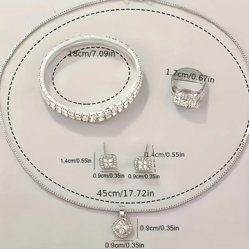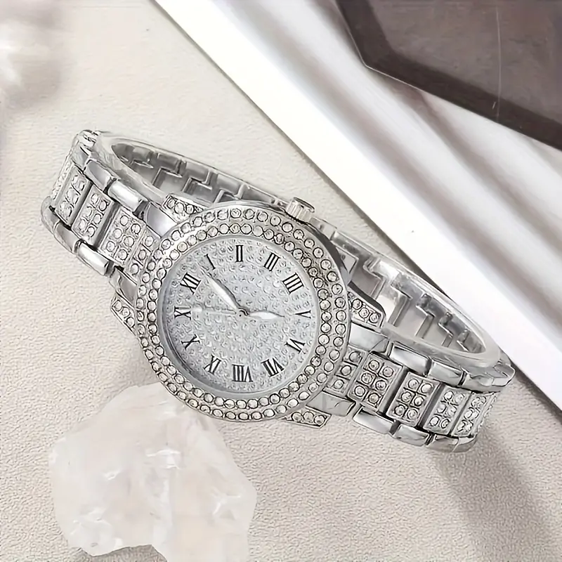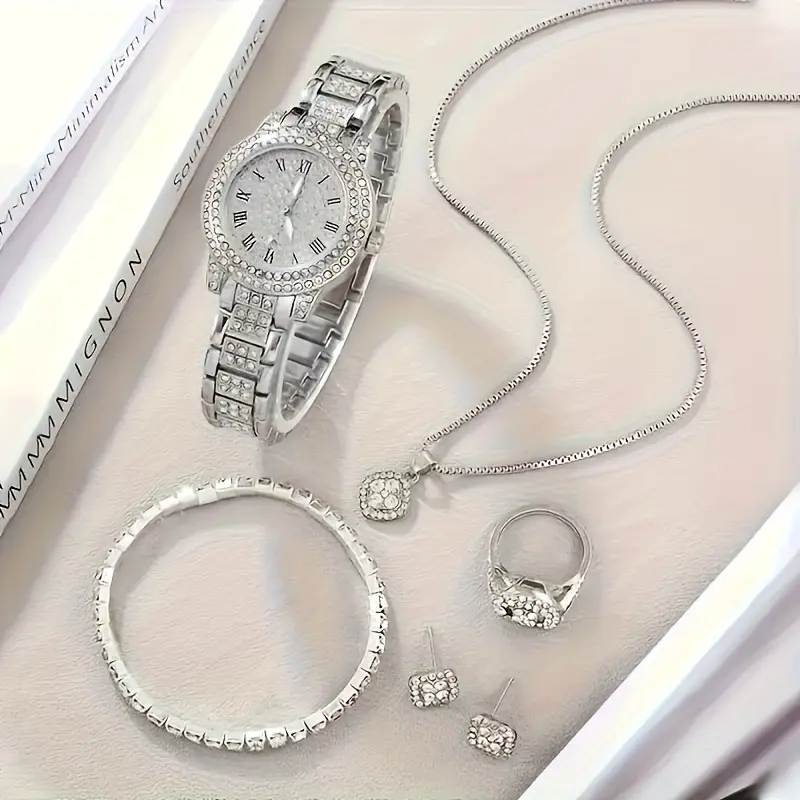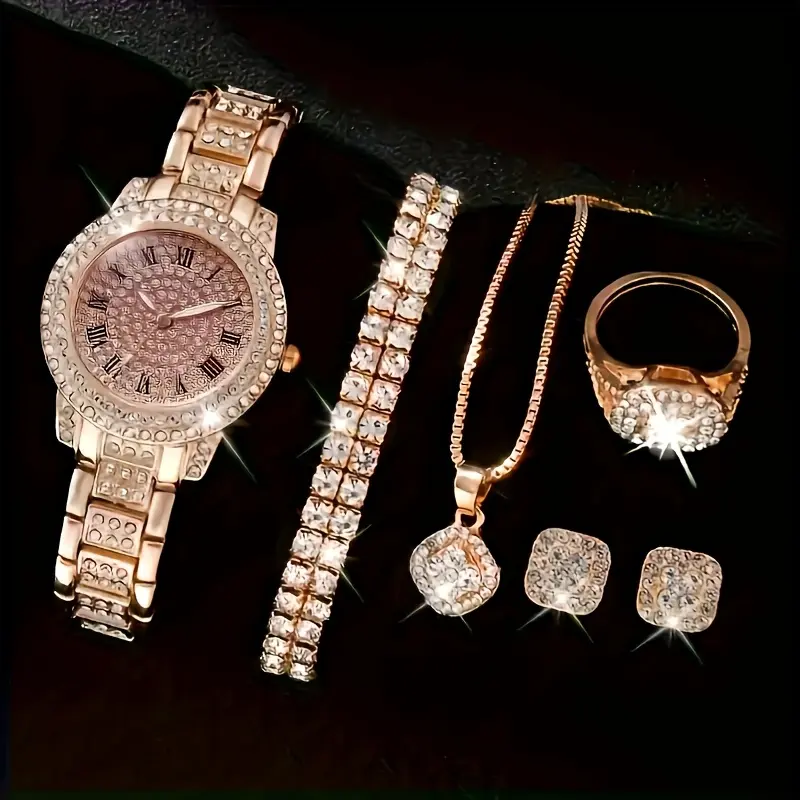 This set features a fashionable quartz watch with Roman numerals, a coordinating bracelet, a sophisticated ring, a timeless necklace, and a stylish pair of earrings-perfectly matched for a refined appearance.
