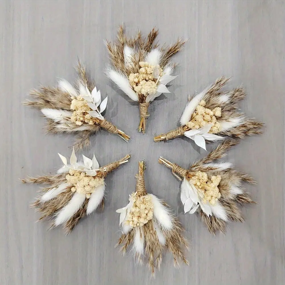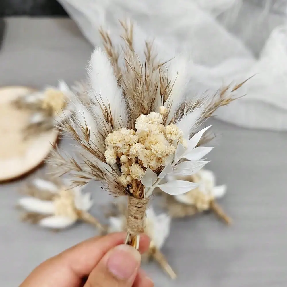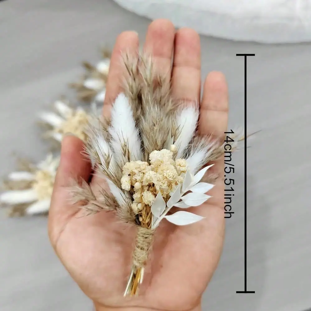 Includes 12 mini handmade dried flower bouquets in soft neutral tones, designed with natural textures and boho charm for elegant wedding and event styling.