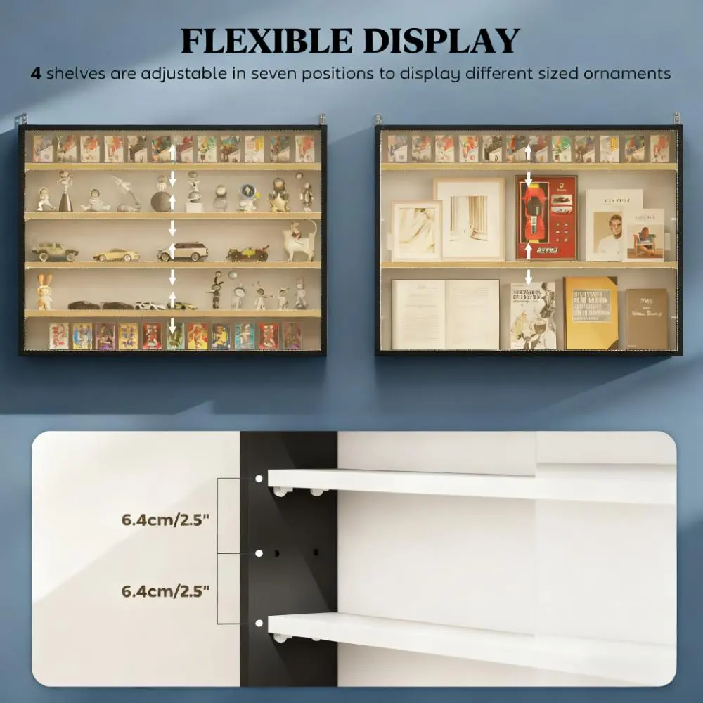 ·This sleek glass display cabinet is perfect for showing off your medals, figurines, and collectibles with elegant transparency. It features 4 adjustable shelves with 7 height positions, allowing you to organize your treasures flexibly.