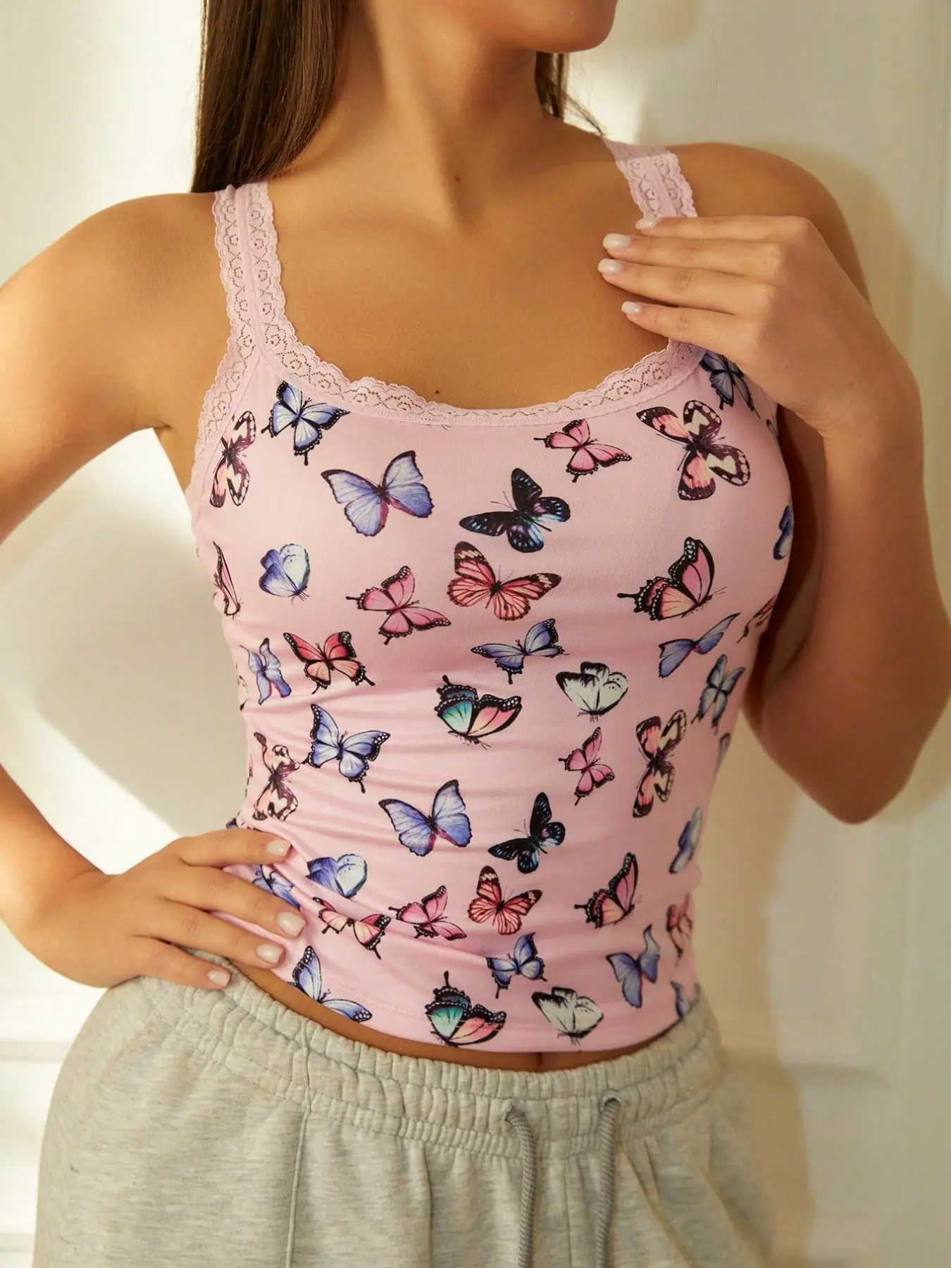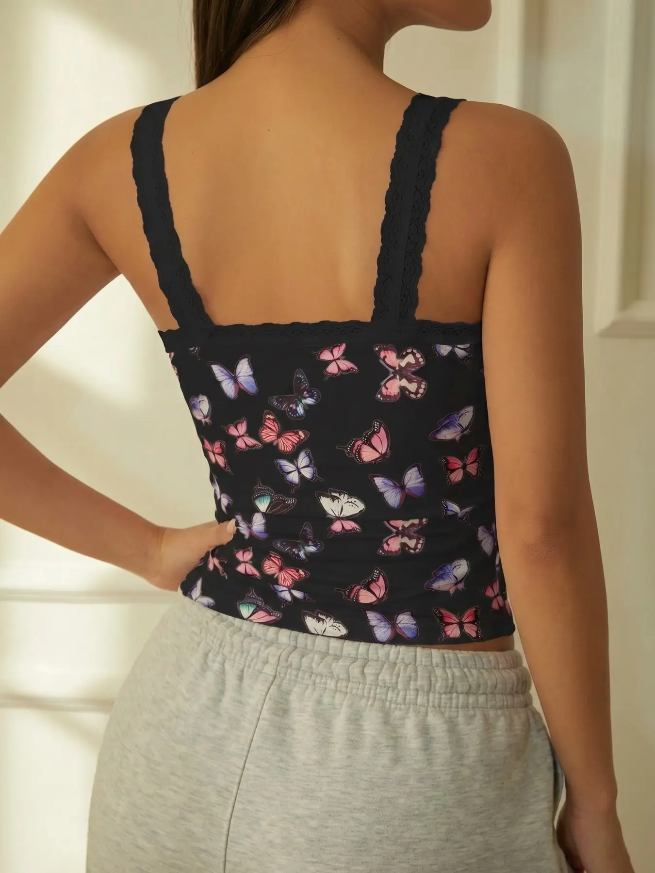 Butterfly Print Ribbed Slim-Fit Cami Top, Lace Trim Square Neck Cropped Tank, Stretchy Skin-Friendly Layering Shirt for Daily Wear & Loungewear