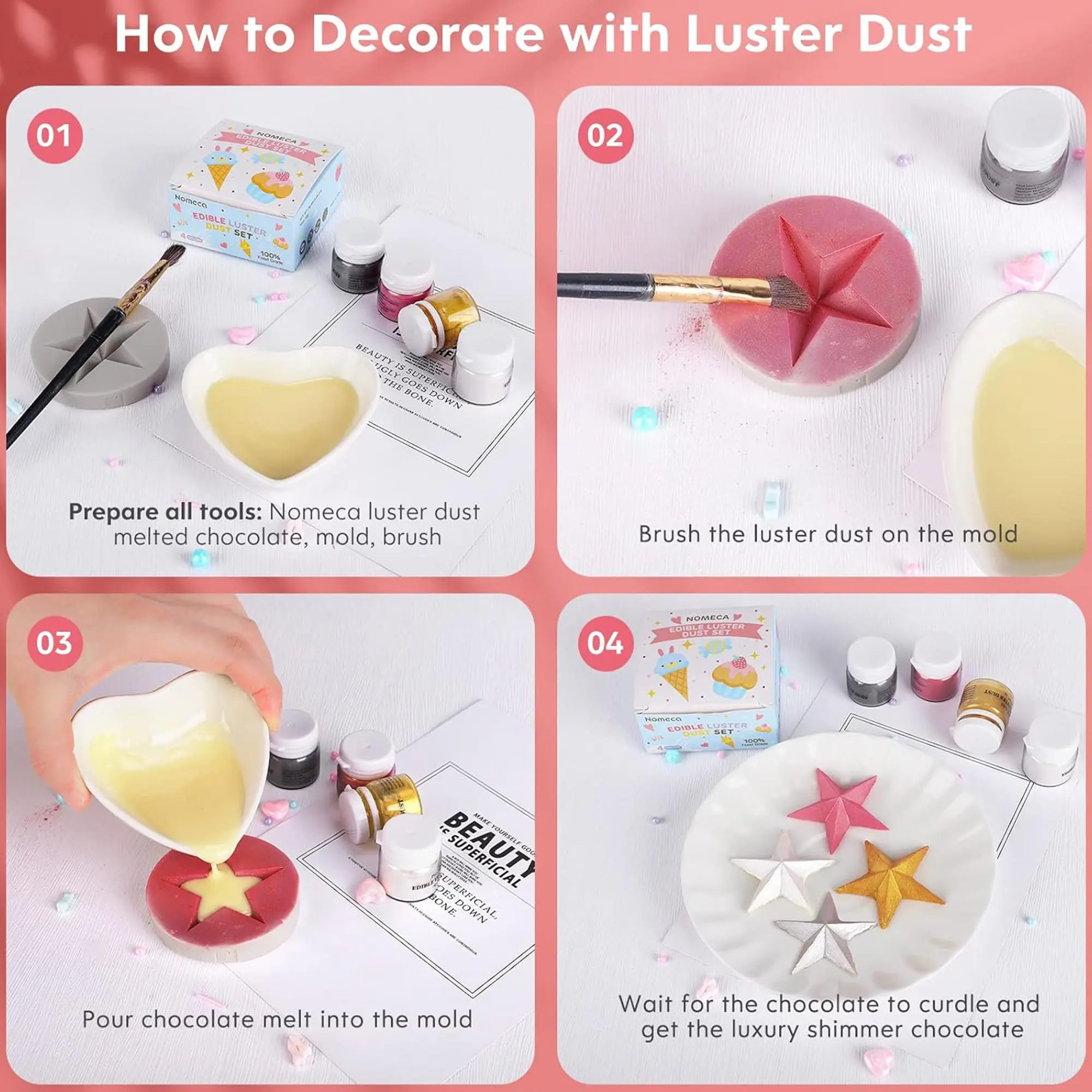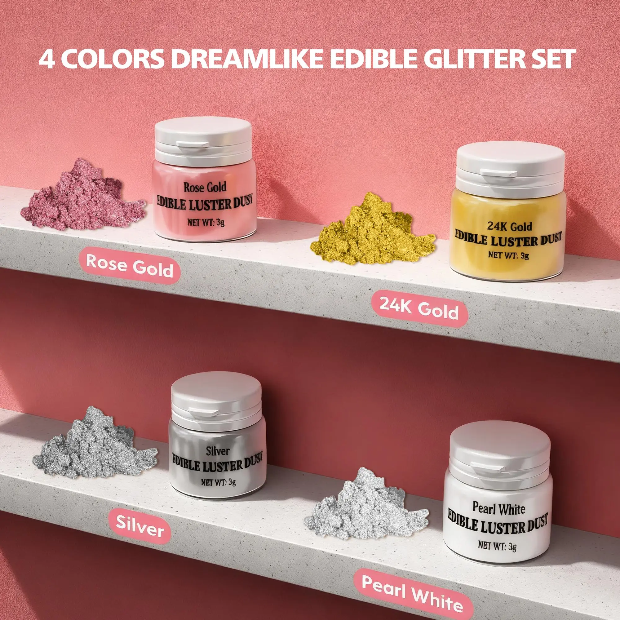 ·Get a fine-textured dust powder that shimmers like magic. Create high-luster/glitter effects and add a metallic touch to cakes, chocolates, and candies. Choose from 4 colors: 24K gold, rose gold, silver, and pearl white.