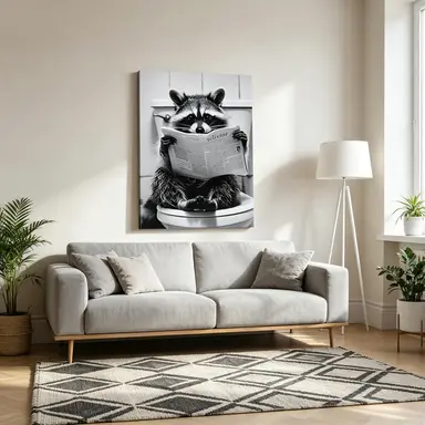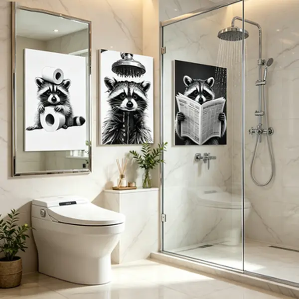 · Minimalist Funny Animal Theme: This curated set features adorable raccoons in whimsical bath & toilet scenes, crafted in a sleek minimalist black-and-white style. The perfect playful touch to bring lighthearted humor to your bathroom, restroom, living room, or any wall in your home.