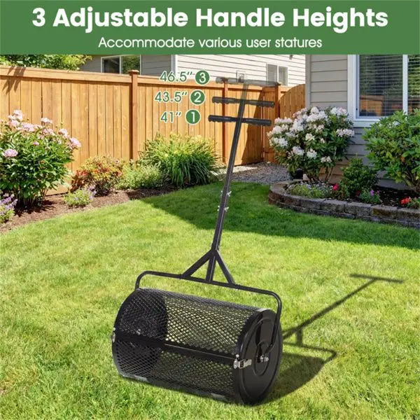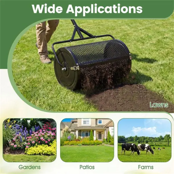 • Reinforced Metal Construction: Built from heavy-duty metal frame, this peat moss spreader is deform-resistant, ensuring a sturdy foundation for extended garden use.Plus, enhanced with reinforced side latches, it keeps the basket firmly closed during rolling and ensures tidy operation.