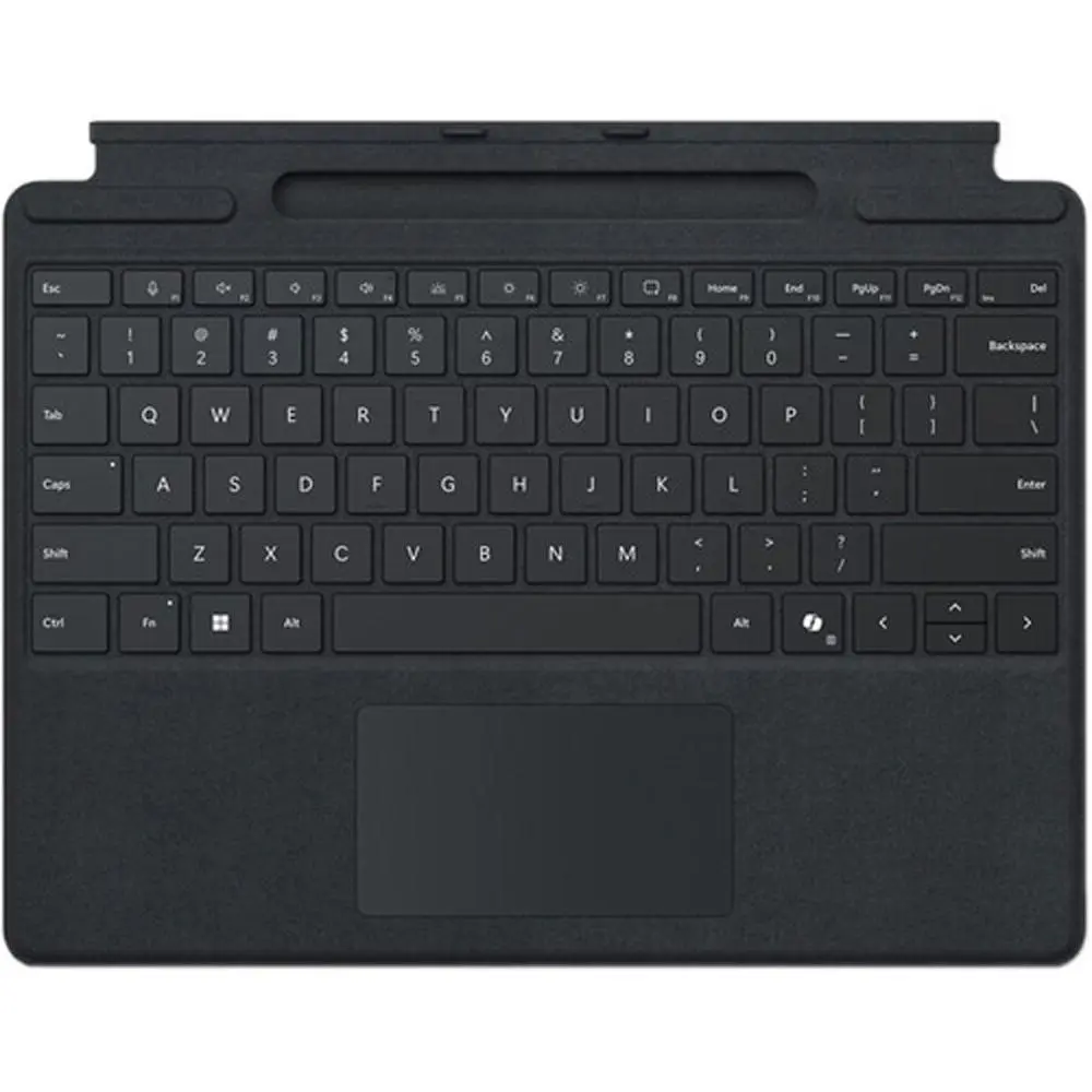 Designed with elegant black colored Alcantara fabric, the Microsoft Surface Pro Keyboard for Business with Pen Storage attaches magnetically to your compatible Surface Pro to provide a smooth and comfortable laptop-like typing experience. This mechanical keyboard cover device also enhances your productivity with a dedicated Microsoft Copilot key, integrated shortcut keys, and a built-in glass touchpad. A convenient storage tray keeps your separately purchased Surface Slim Pen for Business nearby while providing easy recharging.