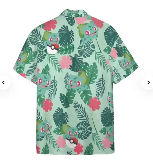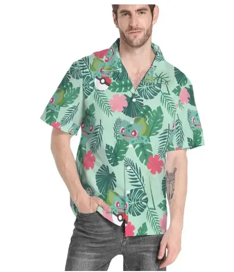 PKM Bulbasaur Tropical Green Hawaii Shirt, Cute Video Game Monster Apparel For Men Women, Fun Printed Summer Vacation Outfit
