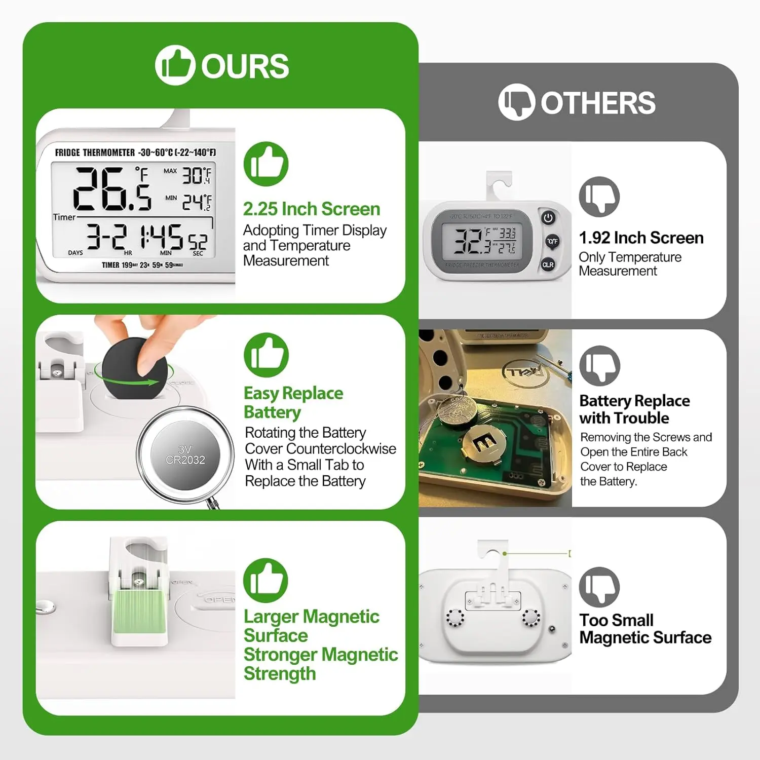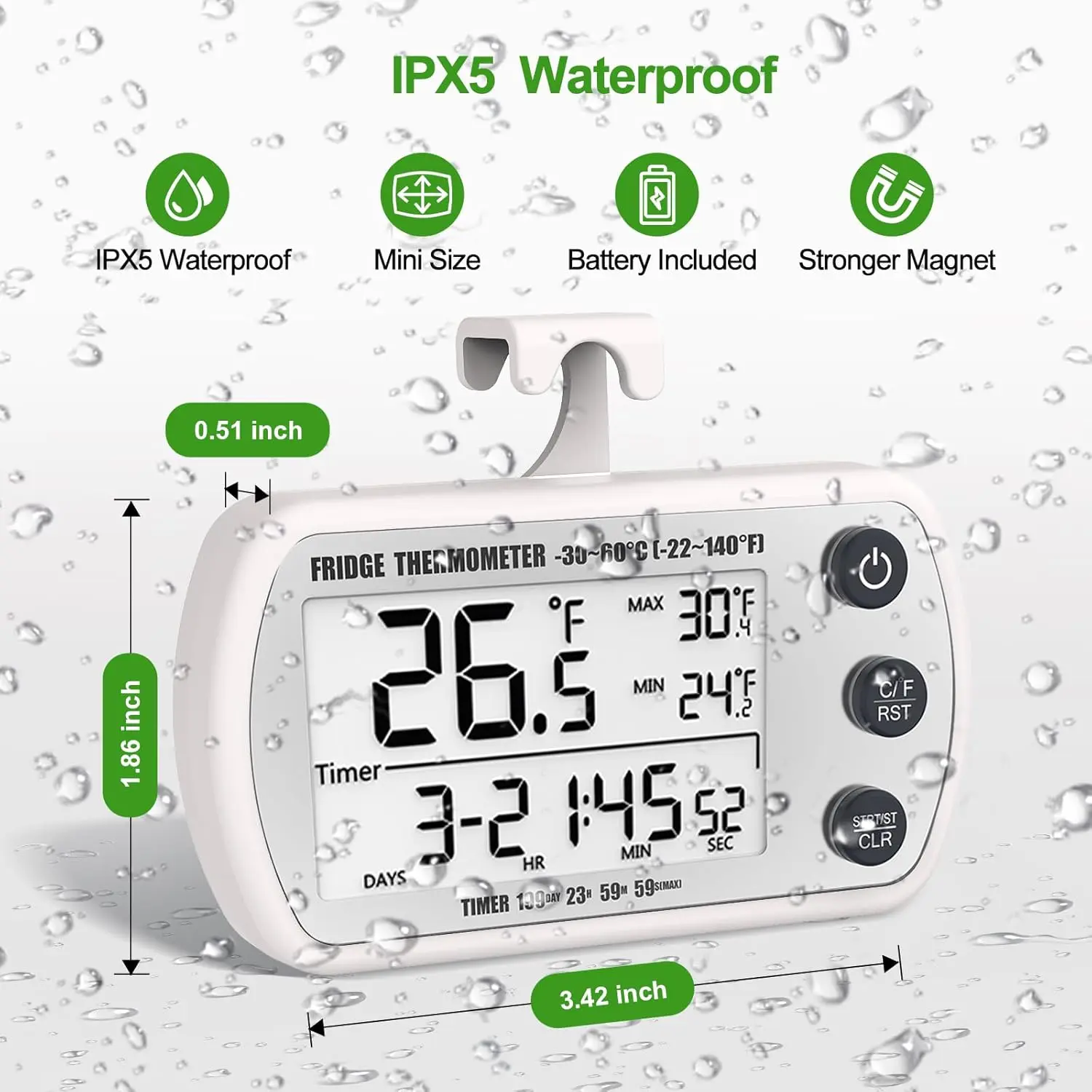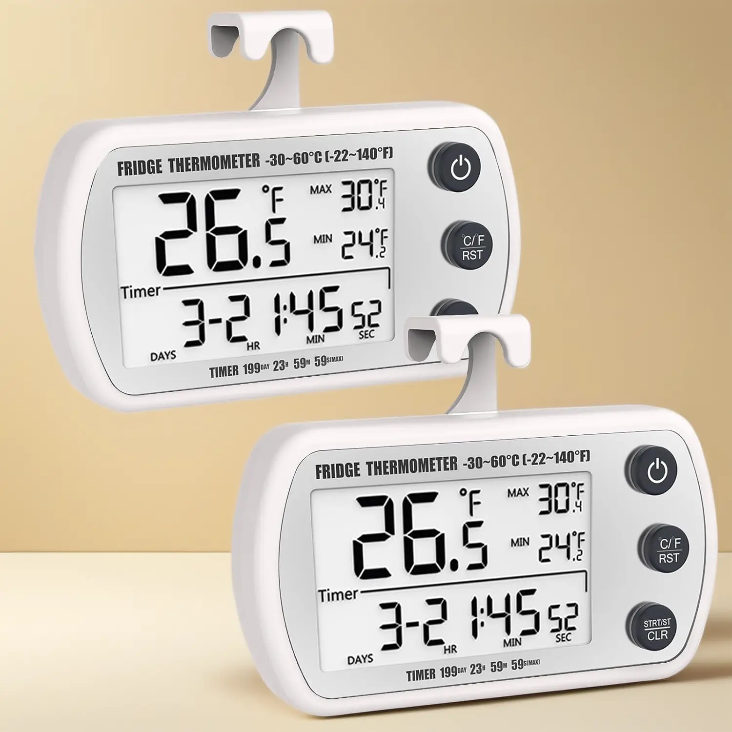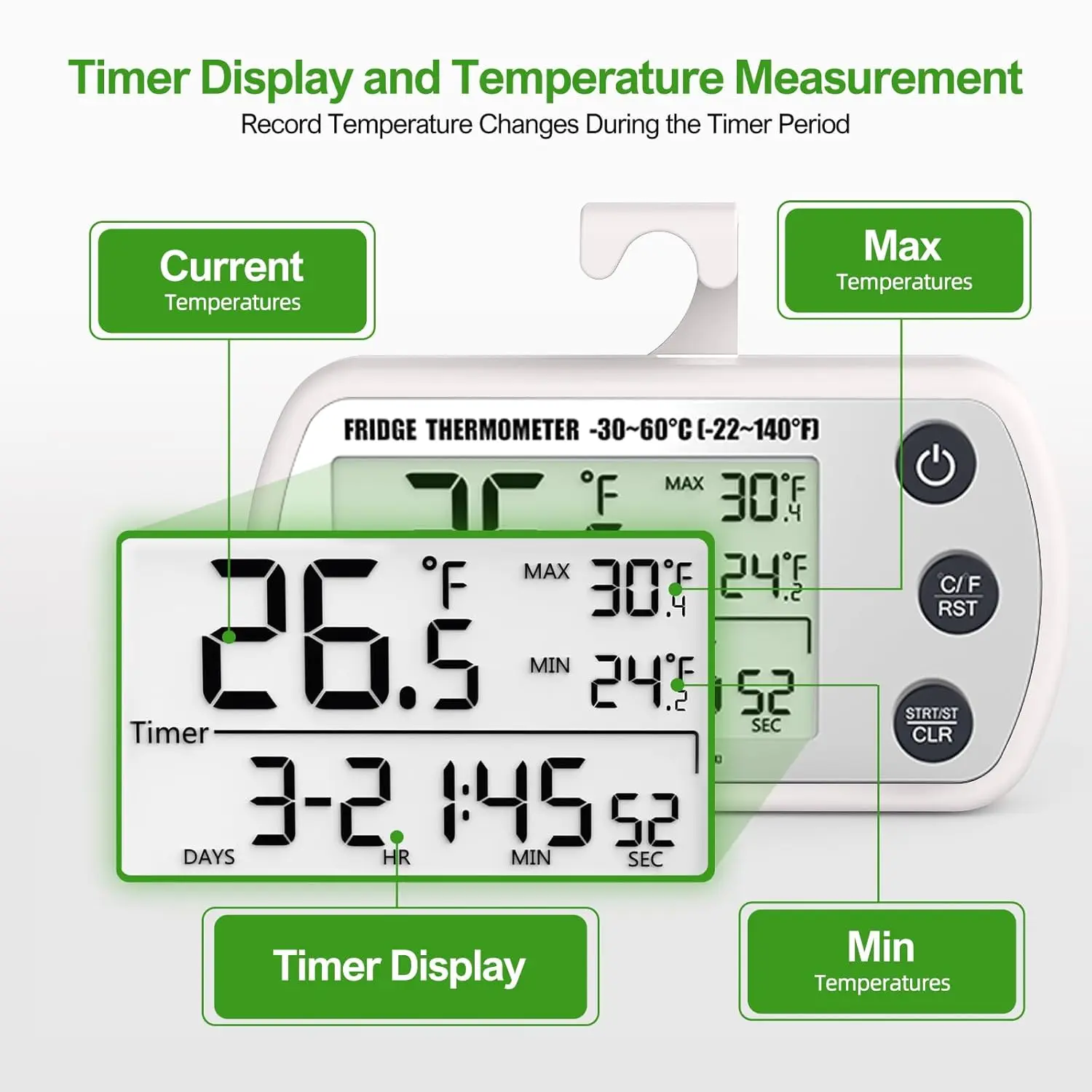 2-in-1 Fridge & Freezer Thermometer 2 Pack, Waterproof Digital Display with 2.25" Easy-Read Screen, Records Max/Min Temperature & Includes Timer Function (White)