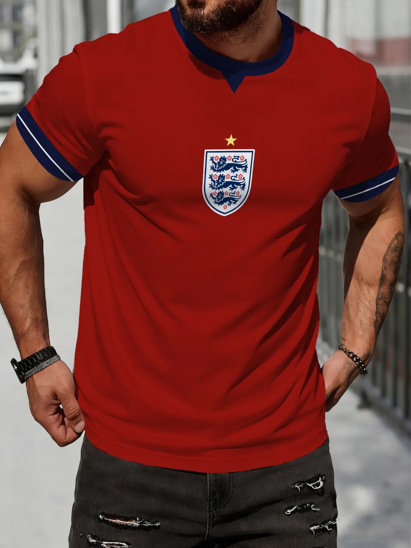 5. England National Team Three Lions Emblem Retro V-Neck 3D Print Short Sleeve Men's Football Fan T-Shirt, Casual All-Season Top