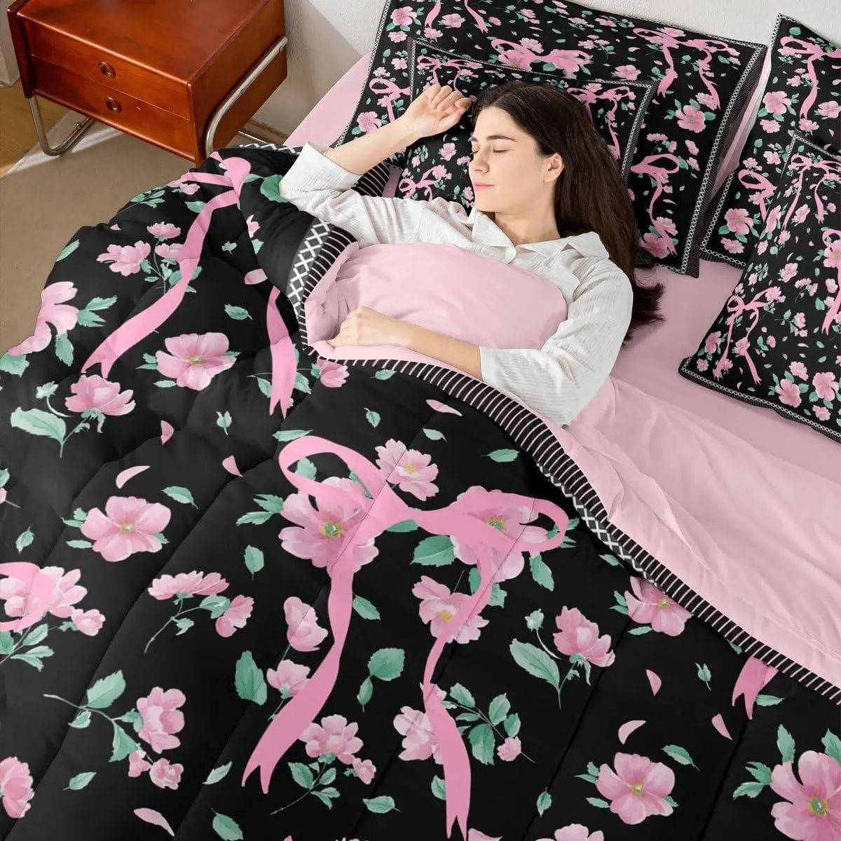 5. Coquette Pink Bow 7 Piece Comforter Set,Girly Bowknot Floral Bedding Set,for Kids | Cute Bow Tie Ribbons Garden Flowers Sheet Set with Comforter Princess Pastoral Style Duvet Set