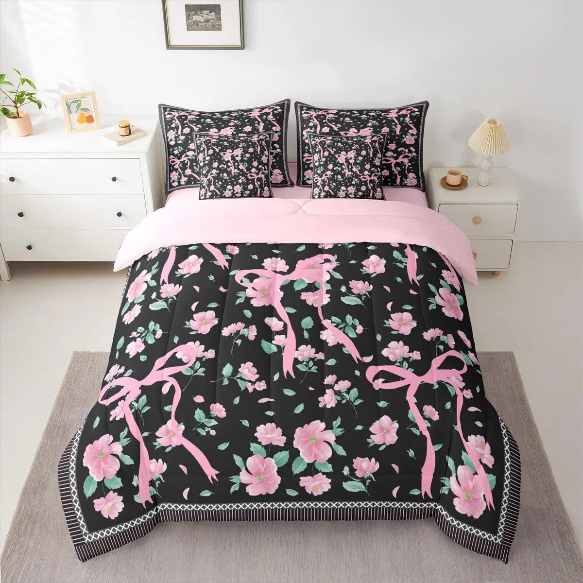 Coquette Pink Bow 7 Piece Comforter Set,Girly Bowknot Floral Bedding Set,for Kids | Cute Bow Tie Ribbons Garden Flowers Sheet Set with Comforter Princess Pastoral Style Duvet Set