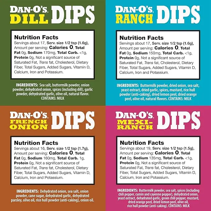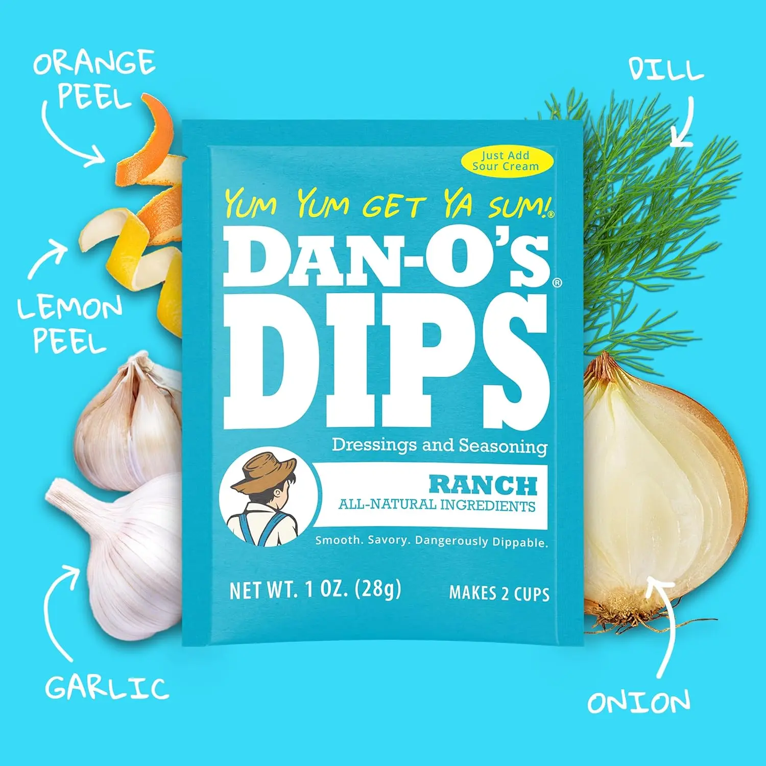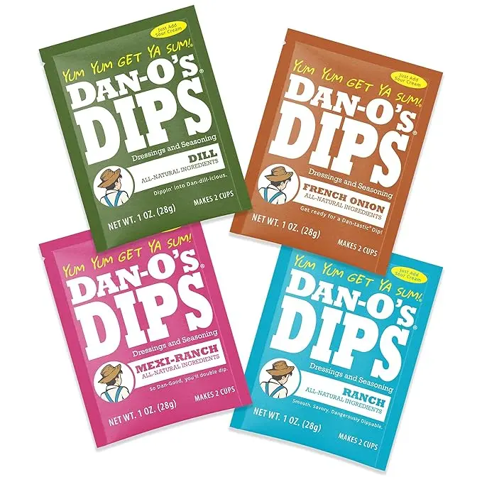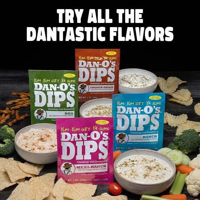 ·Four Signature Dan-O’s Dip Flavors: Includes one packet each of Ranch, Mexi-Ranch, French Onion, and Dill (1 oz each) — a curated sampler of Dan-O’s boldest, most-loved dip flavors