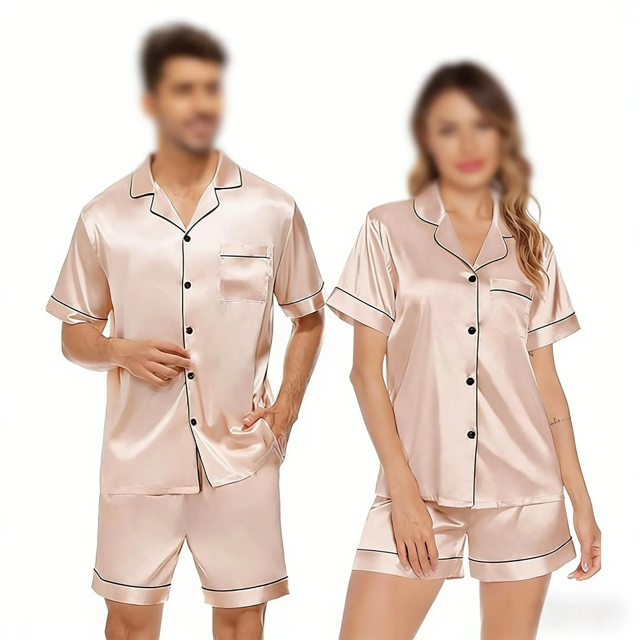 Women's & Men's Matching Satin Pajama Set, Short Sleeve Lounge Wear, Comfortable Couple Nightwear for Valentine's Day, Anniversary, Homewear