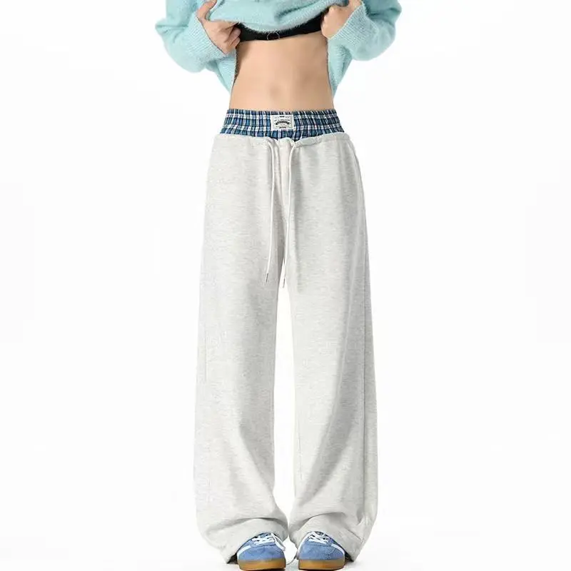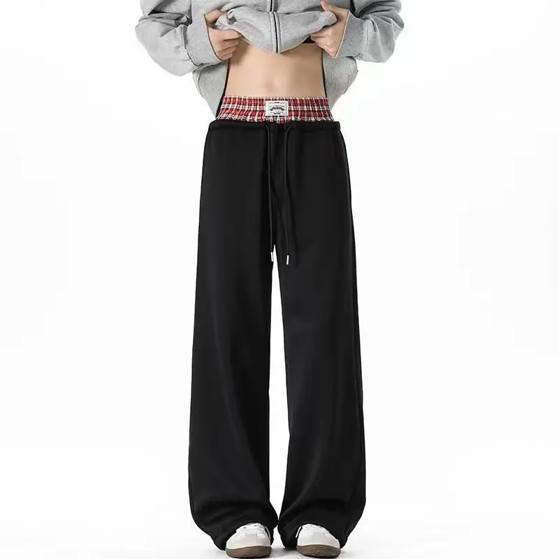 Unisex joggers with double waistband, washed loose fit; wide-leg plaid patchwork casual pants with pockets; comfortable to wear, suitable for daily commuting or leisure activities.