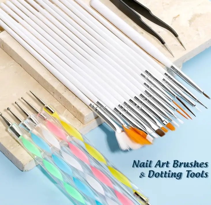·Sweet Set For Your Fantastic Nail Art: What you will get: 15 x nail brushes, 5 x dotting tools, 1 x 12 colors rhinestones, 1 x ultra thin nail art sequins in 12 different shapes, 1 x nail foils, 1 x 12 colors butterfly sequins , 5 x nail stickers, 1 x tweezers