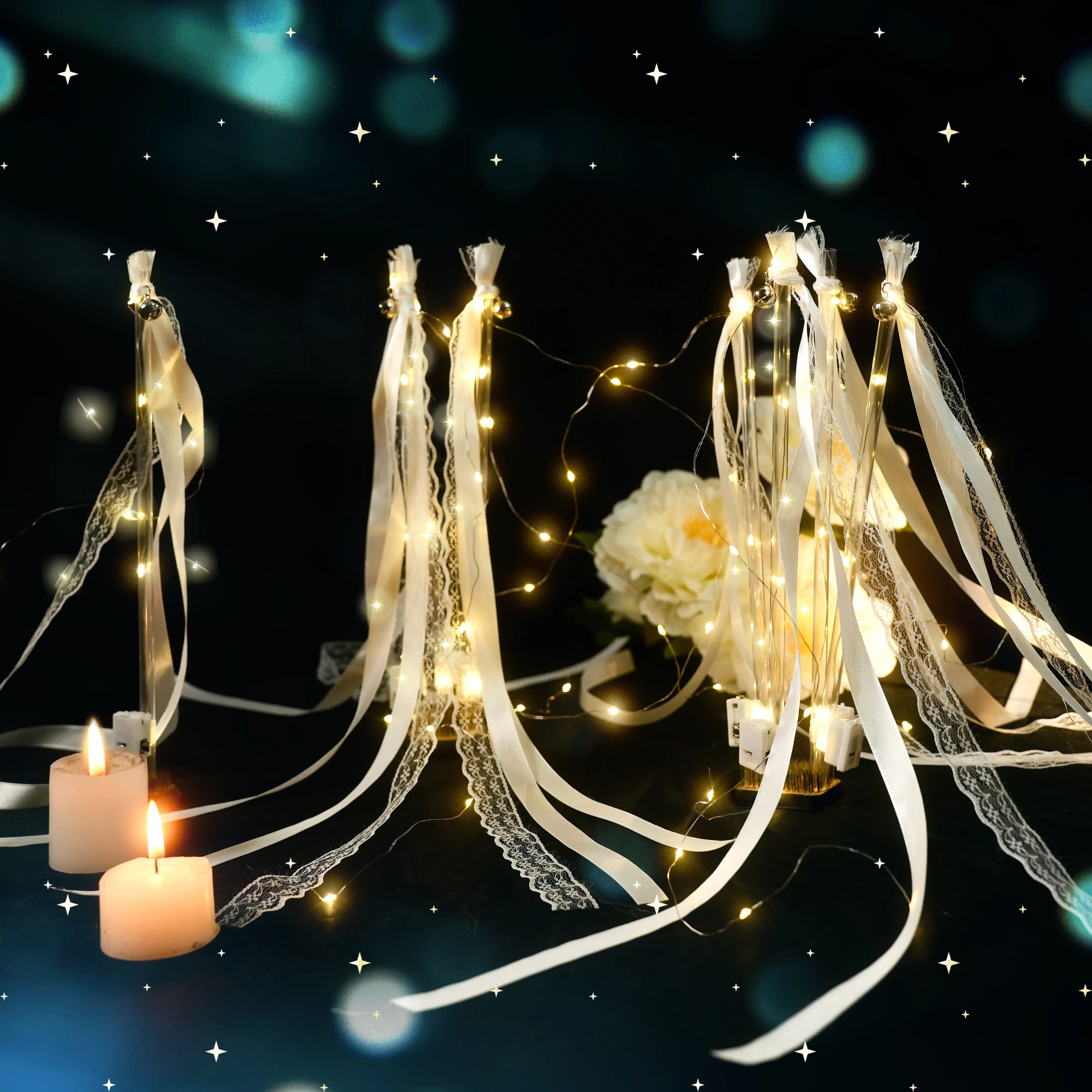 Create a Whimsical Atmosphere: Elevate the ambiance of your wedding or birthday party with our Wedding Wands Ribbon Streamers with Bells. These LED Fairy Light up Silk Fairy Wands are the perfect touch of magic for your event, adding a touch of whimsy and delight to every guest's experience.