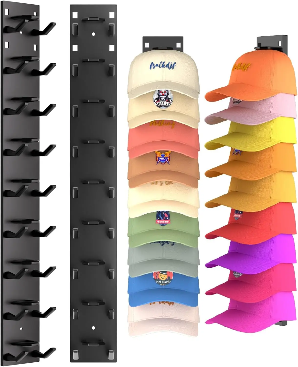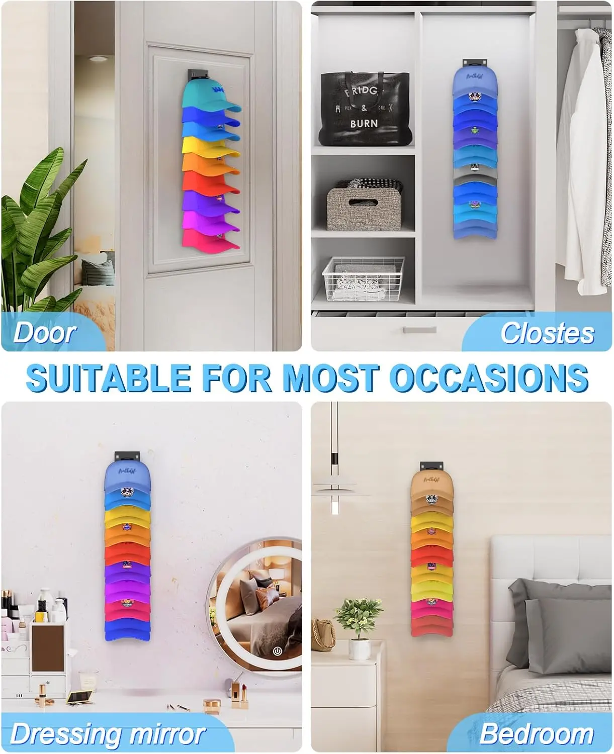 The hat hanger can be hung using the hat buckle, displaying the hat forward for protection. Alternatively, use the brim hanging for quick access. Each rack can hold up to 9 hats. It can be hung on the wall, behind the door, or on a closet.