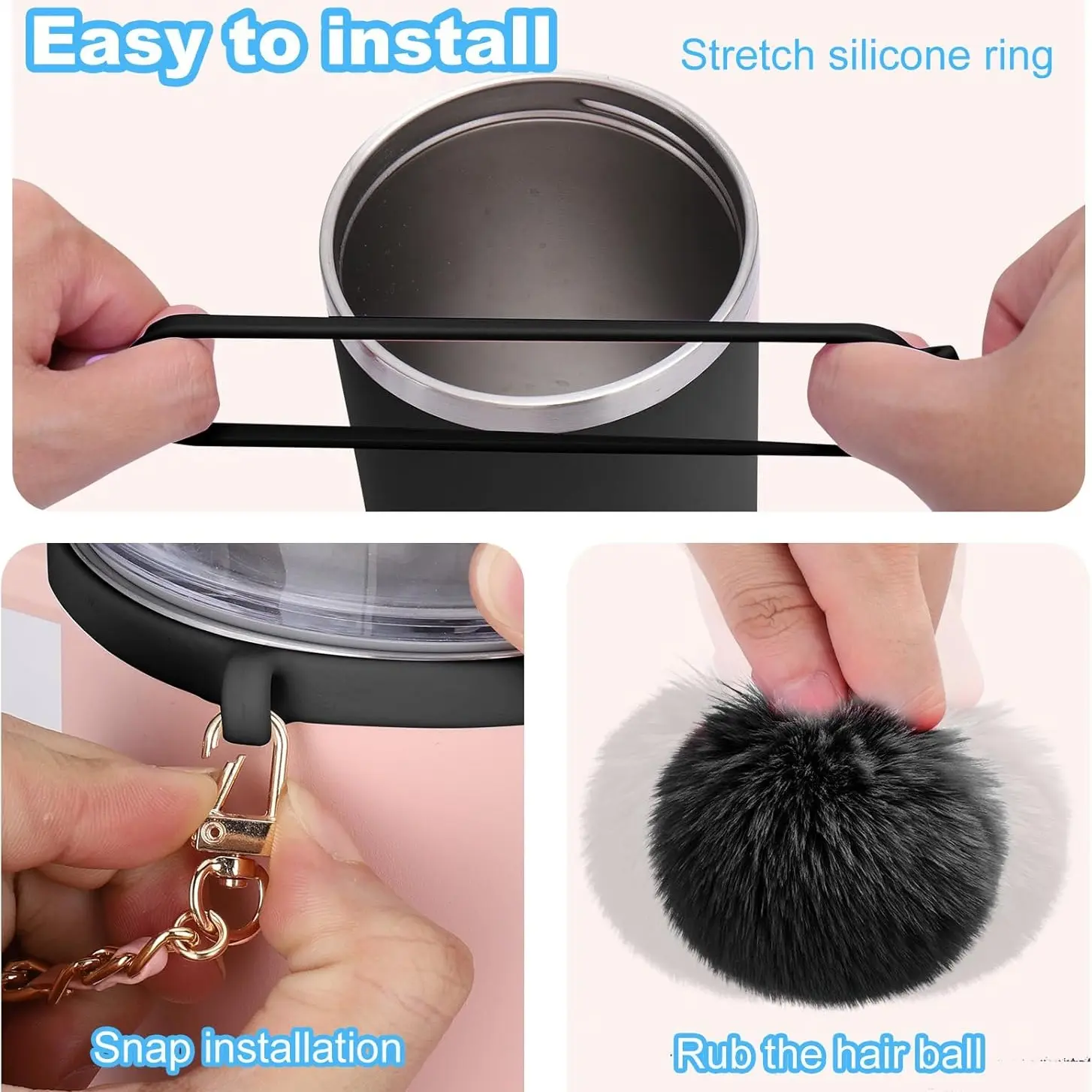 Say goodbye to complicated installations. Customize your tumbler easily. The rubber around the bottle is tight, preventing straps from falling off. The large black bow attaches with an elastic band. All accessories hang from your bottle, making it simple to change the look. Enjoy your tumbler with ease.