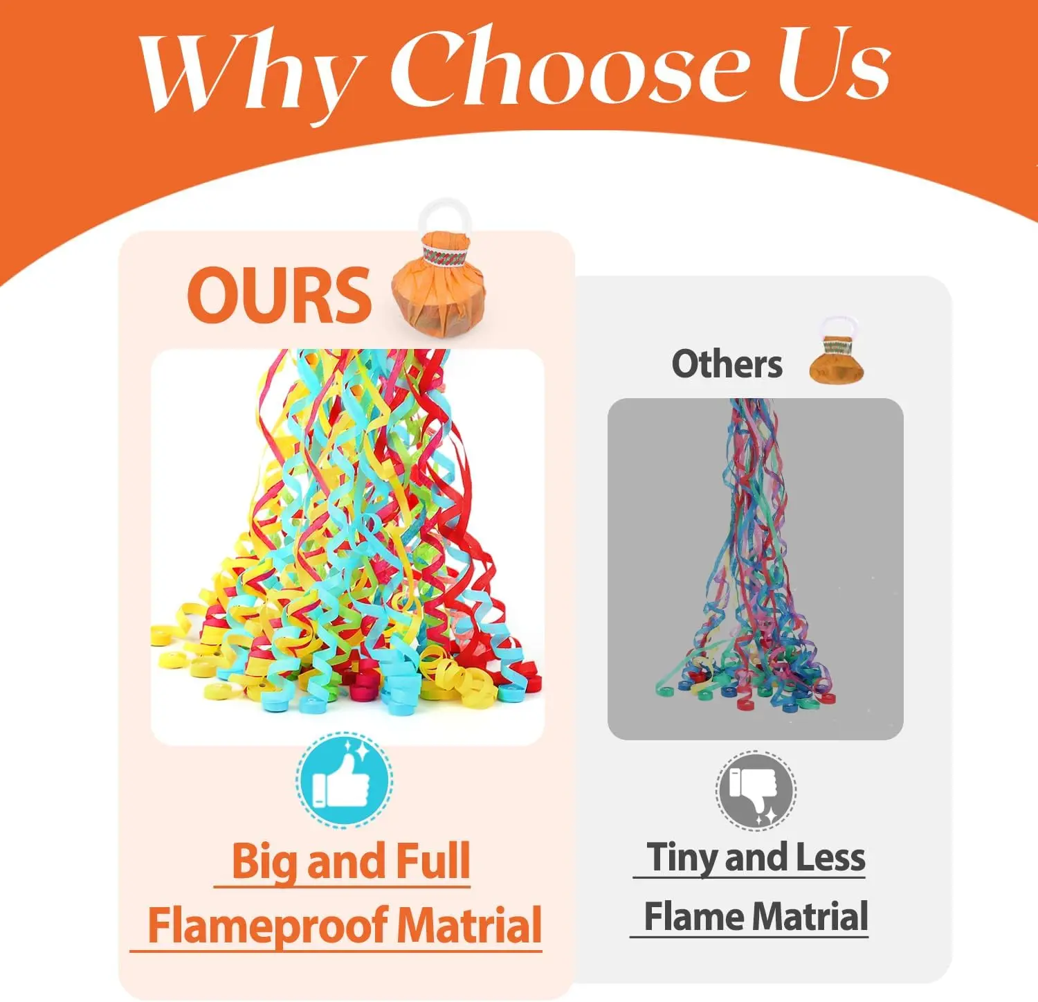 10 Packs with 30 ribboons reach to 15 ft : Made of flame retardant tissue paper. 10 pack colorful party poppers in total, and each crackers poppers has 30pcs ribbions inside, and the length of each streamer is approx 15 ft