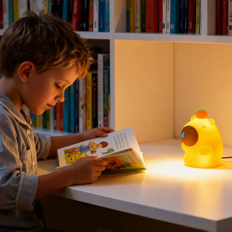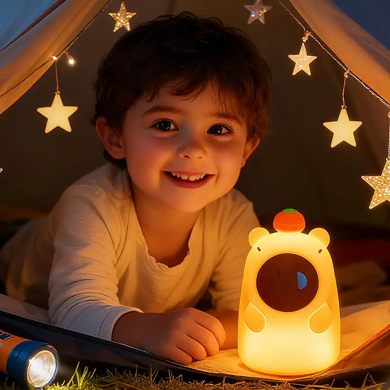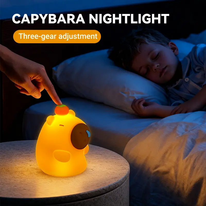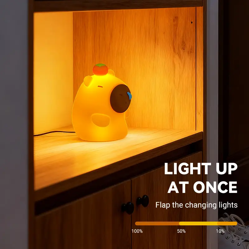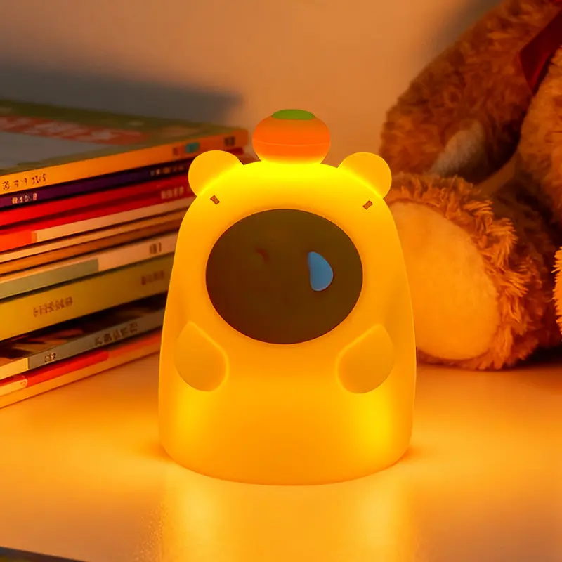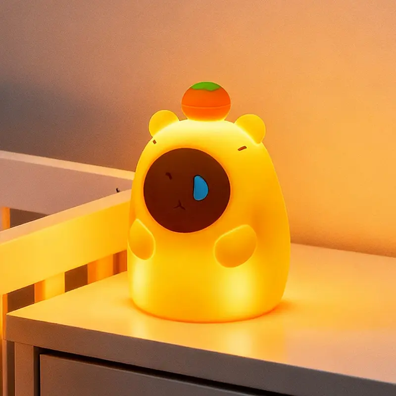 Bring endless warmth and cuteness to your little one's nights with our adorable Capybara Silicone Night Light! Designed with the most charming sleepy capybara shape topped with a tiny persimmon, this night light instantly becomes your child's favorite bedtime companion, chasing away fears of the dark with its gentle glow.