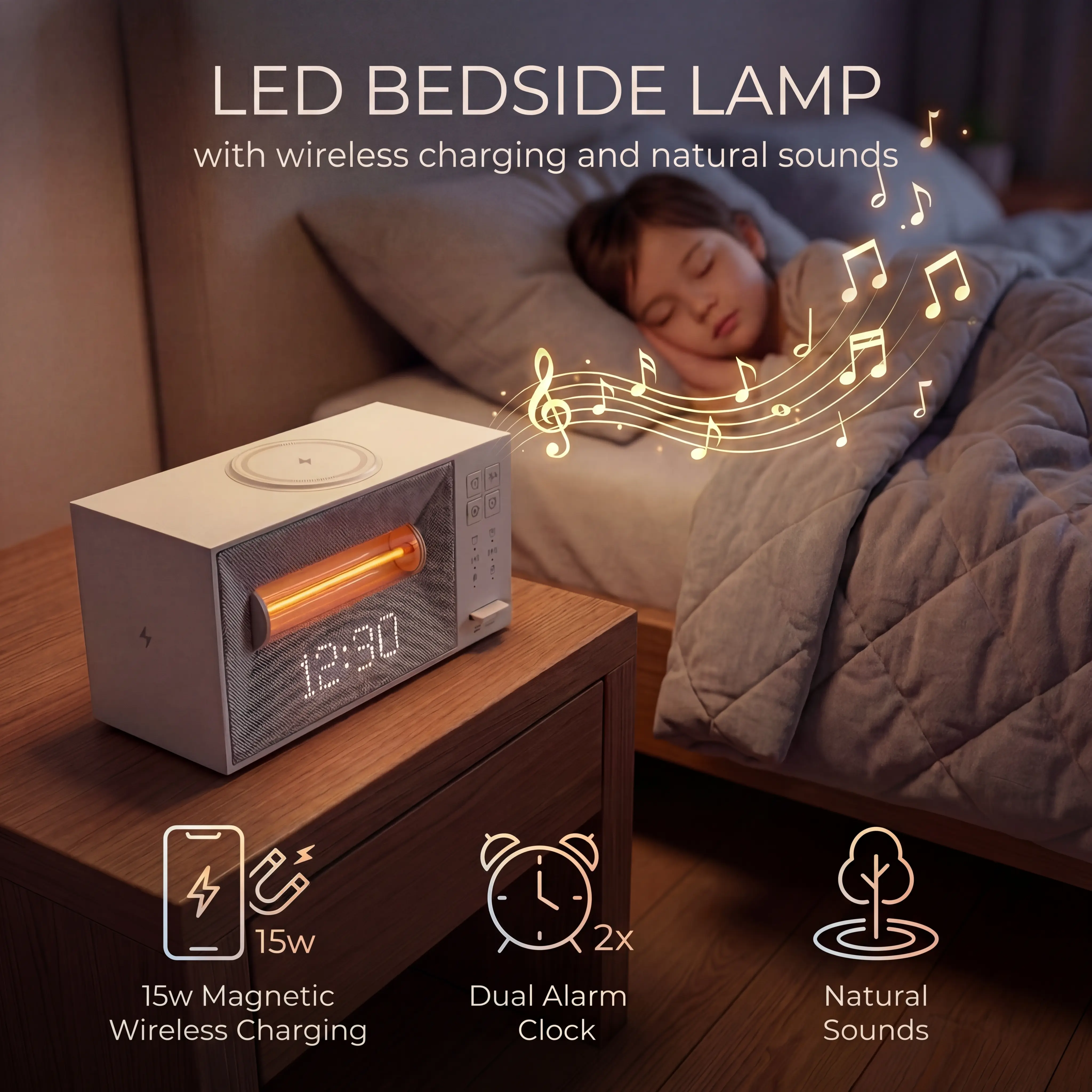 3 Brightness Levels LED Bedside Lamp, 15W Wireless Charger, Dual Alarm Clock with Natural Sleep Sounds