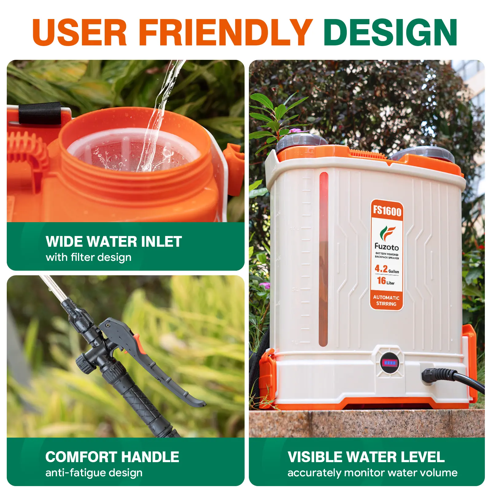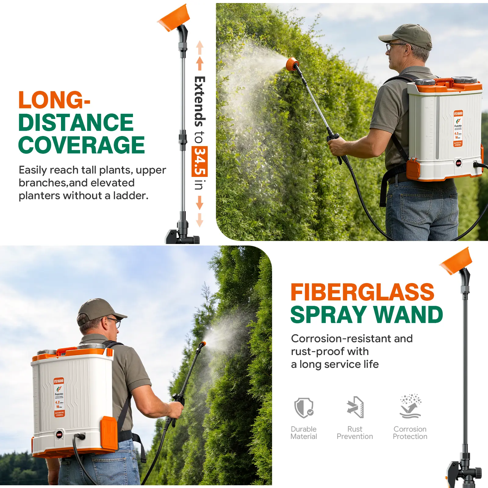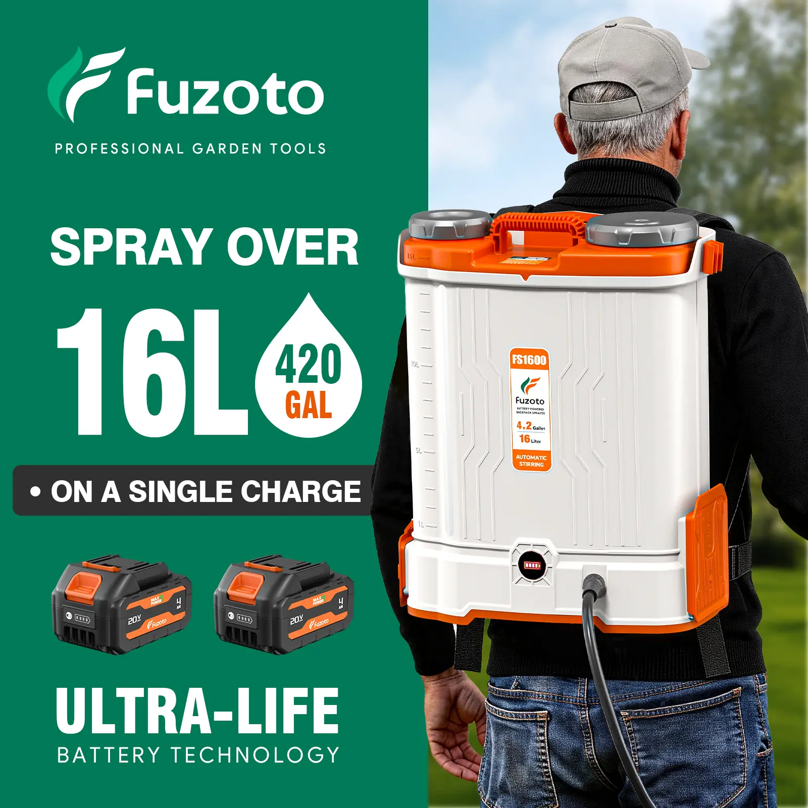 Long Battery Life – 20V 4.0Ah battery runs 4–6 hrs, sprays 250+ gallons