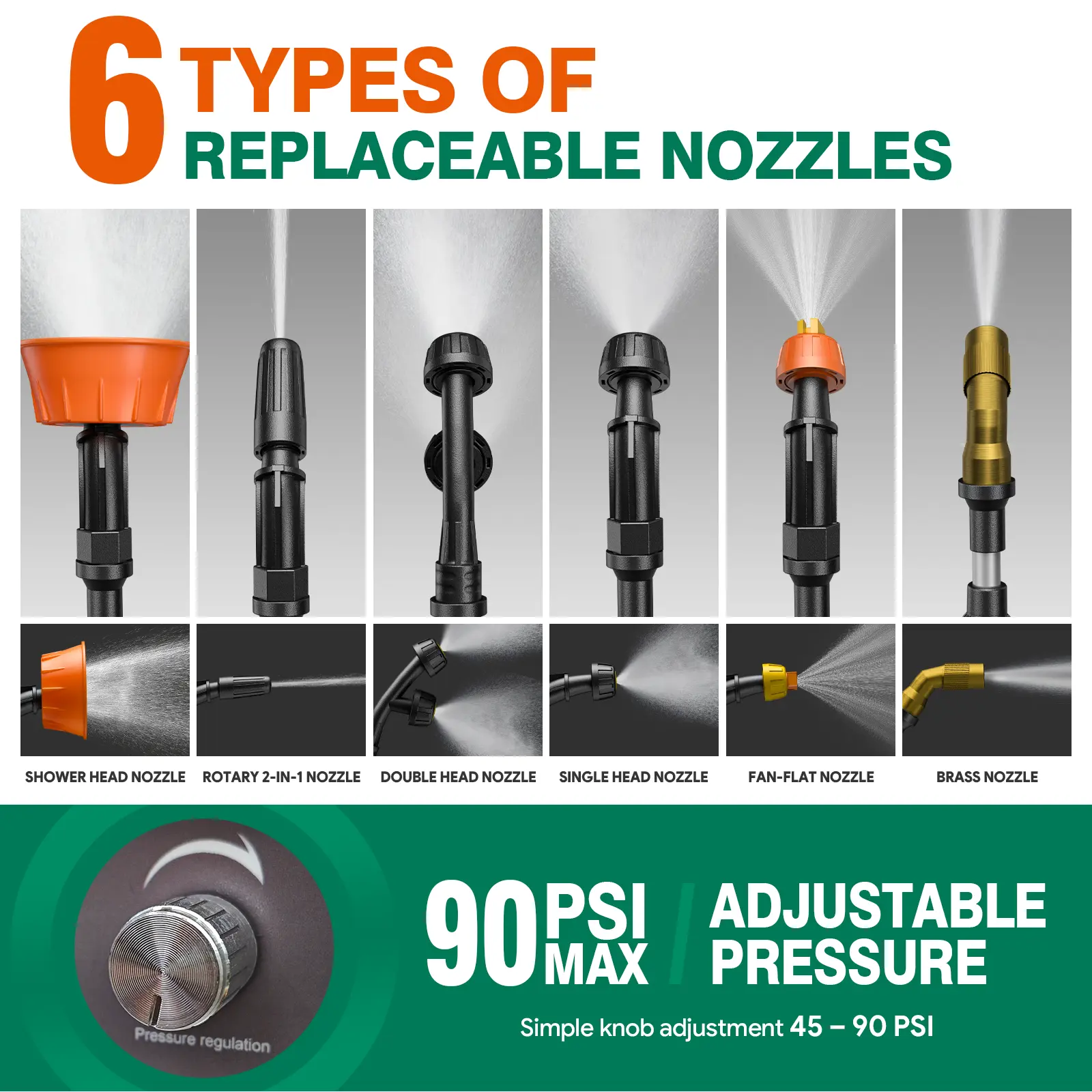 Adjustable Pressure (45–90 PSI) – 6 nozzles for multiple spray needs