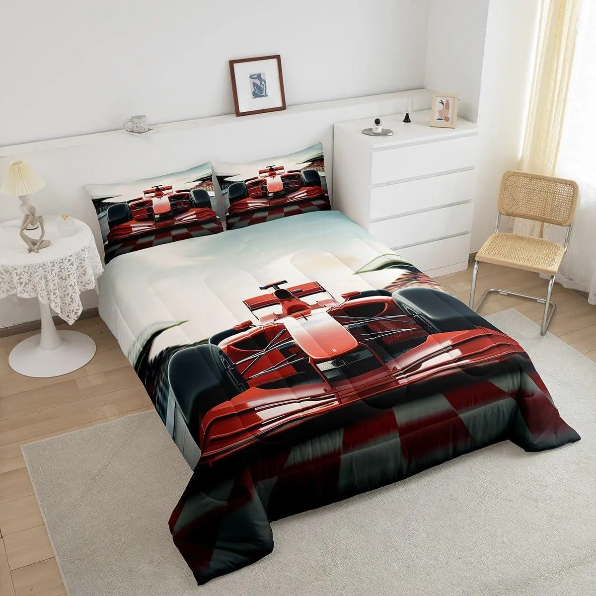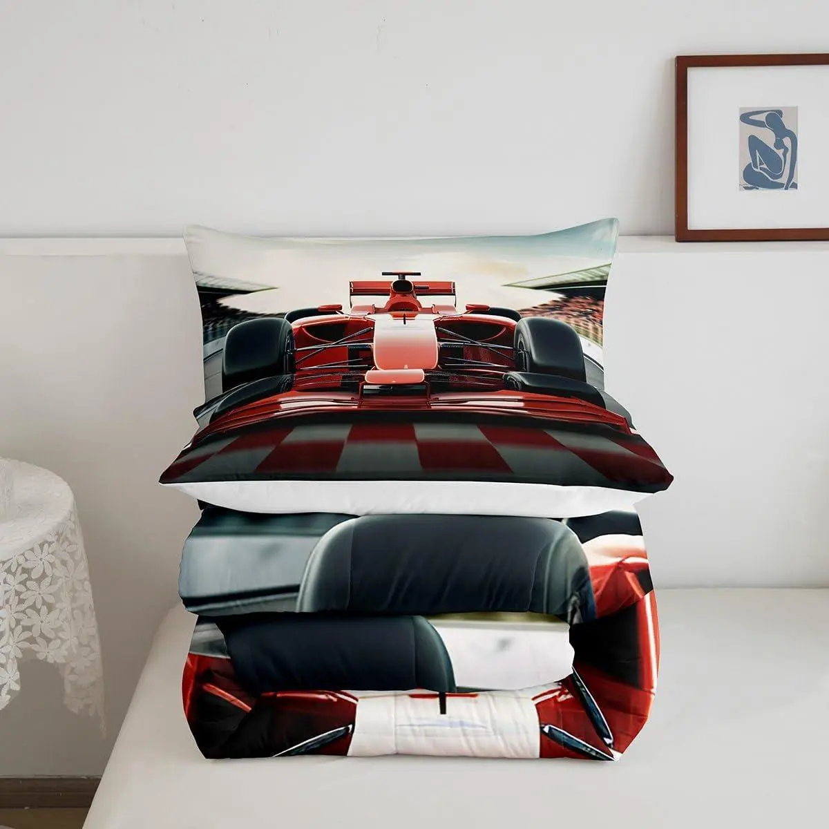 3D Red Formula Car Comforter Set,Cool Racing Car Bedding Set,Kids Teens Modern Decor,Racing Speed Sport Comforter for All Seasons