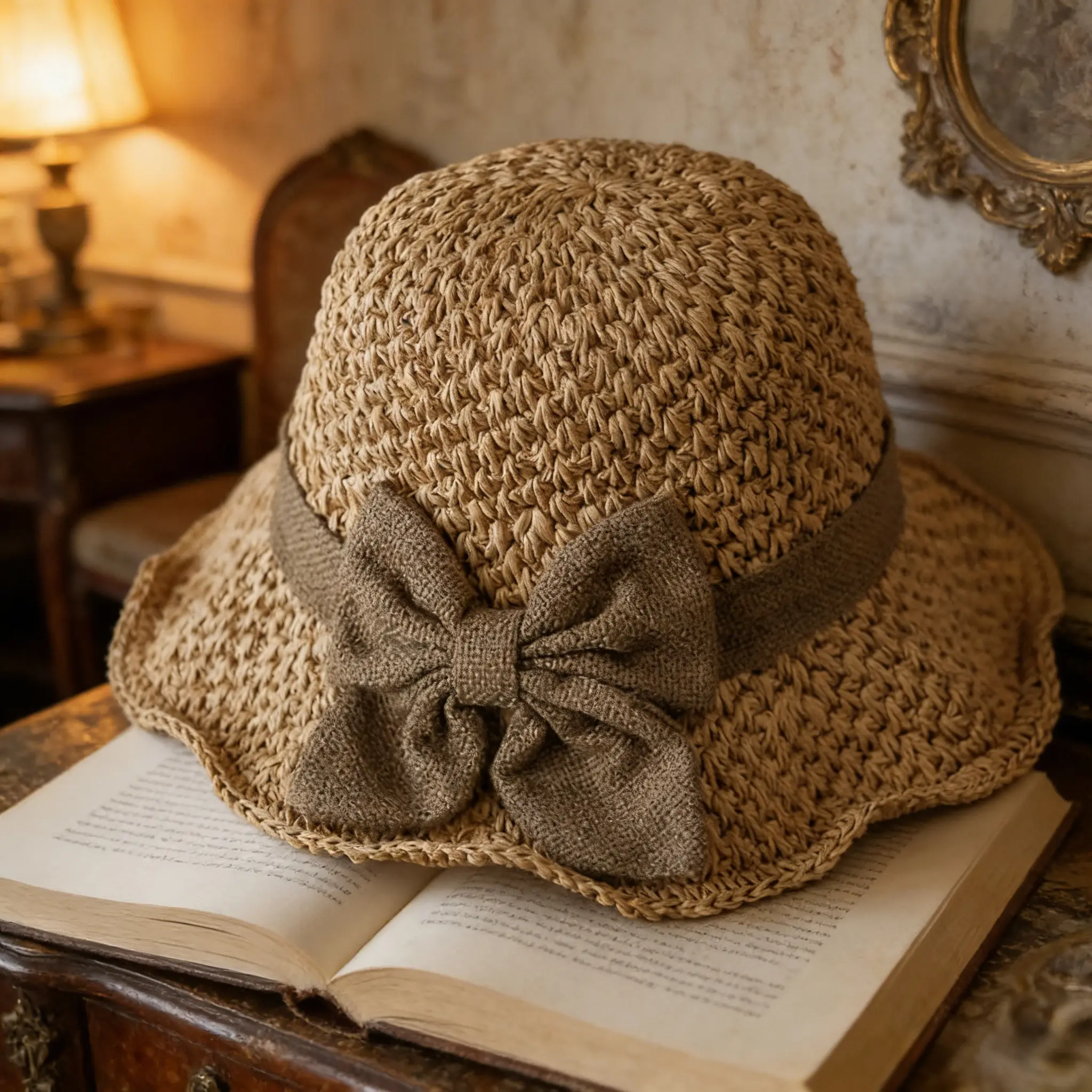 Versatile retro woven handmade straw hat with ruffled bow, elegant French sun hat, foldable, breathable travel beach hat.