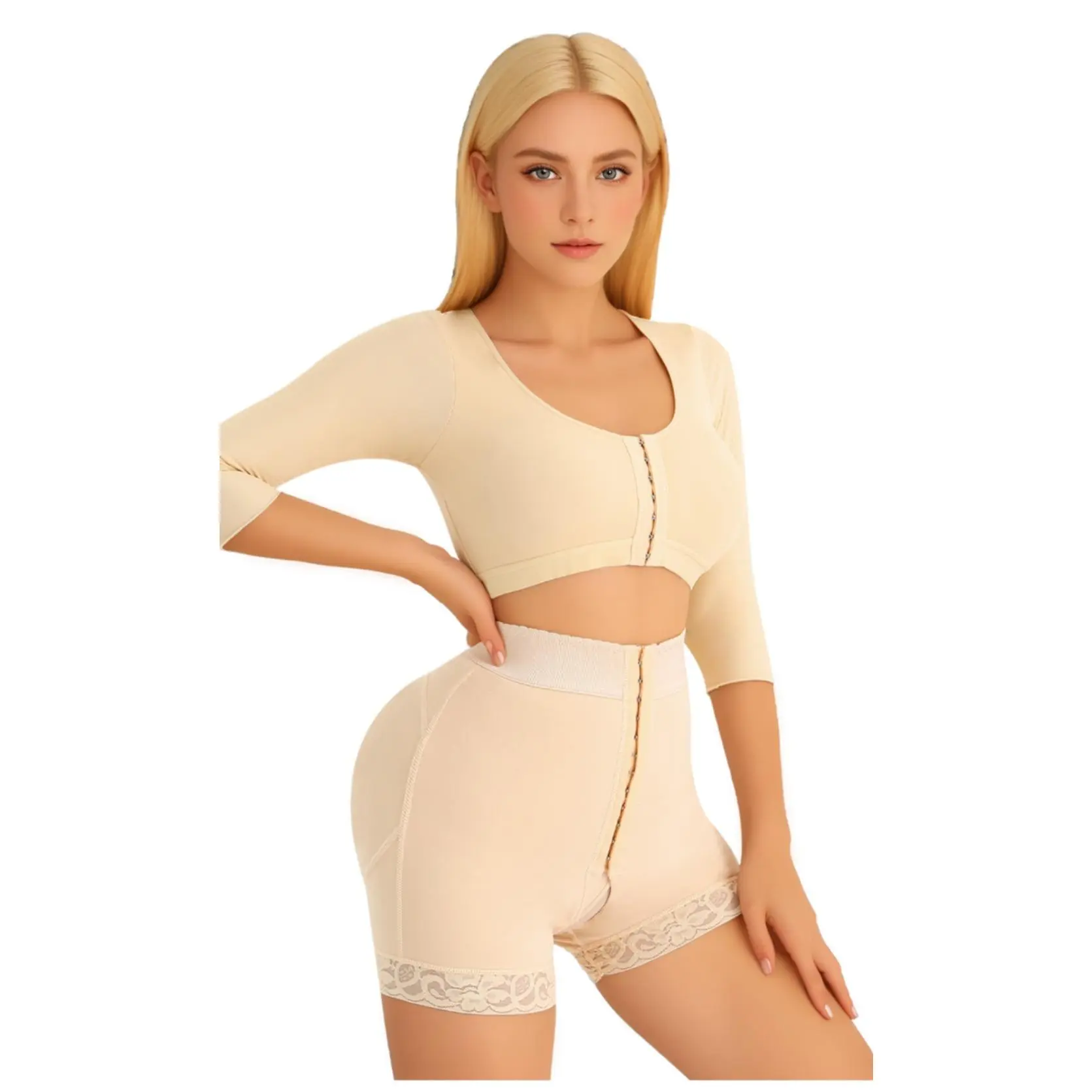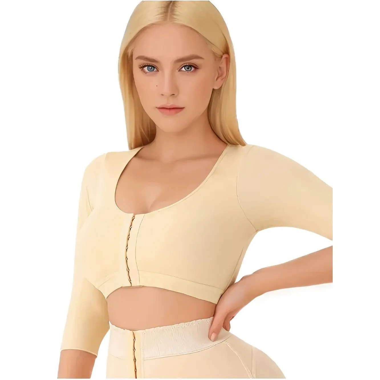Designed for Recovery and Shape. This shapewear bra is perfect for women post-surgery or after arm lipo. It features a front closure design for easy wear. Ideal for those seeking compression and support. The sleeves help in shaping the arms, providing a sleek look.