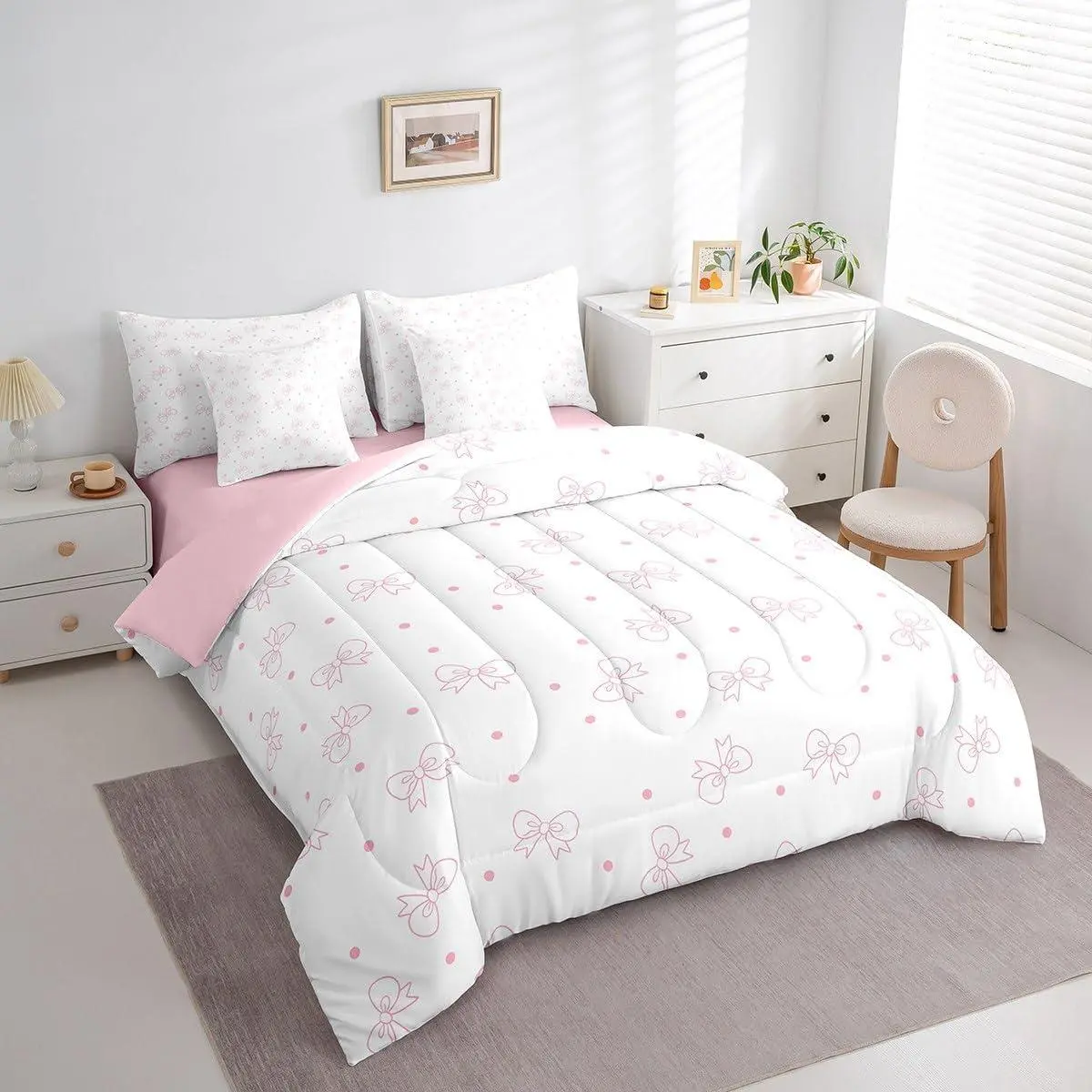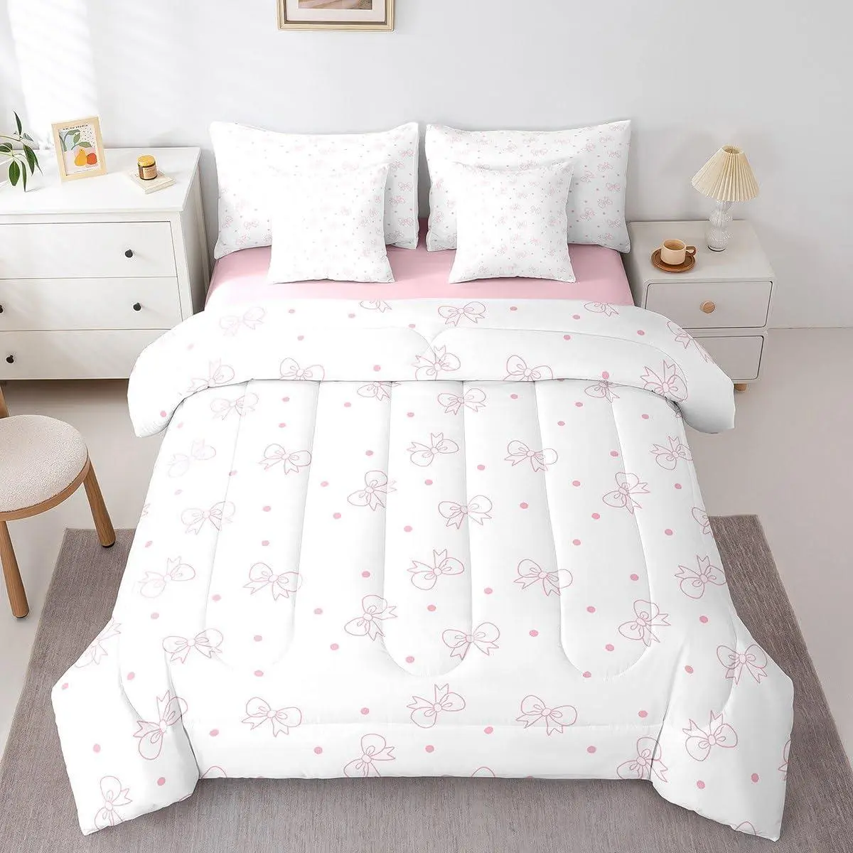 5. 7 Pieces Pink Bows Comforter Set,Cute Bowknot Print Bedding Set,Cartoon Bow Tie Girly Bed in A Bag with Comforter,Sheets and Pillowcases,Kids Girls Princess Room Decor