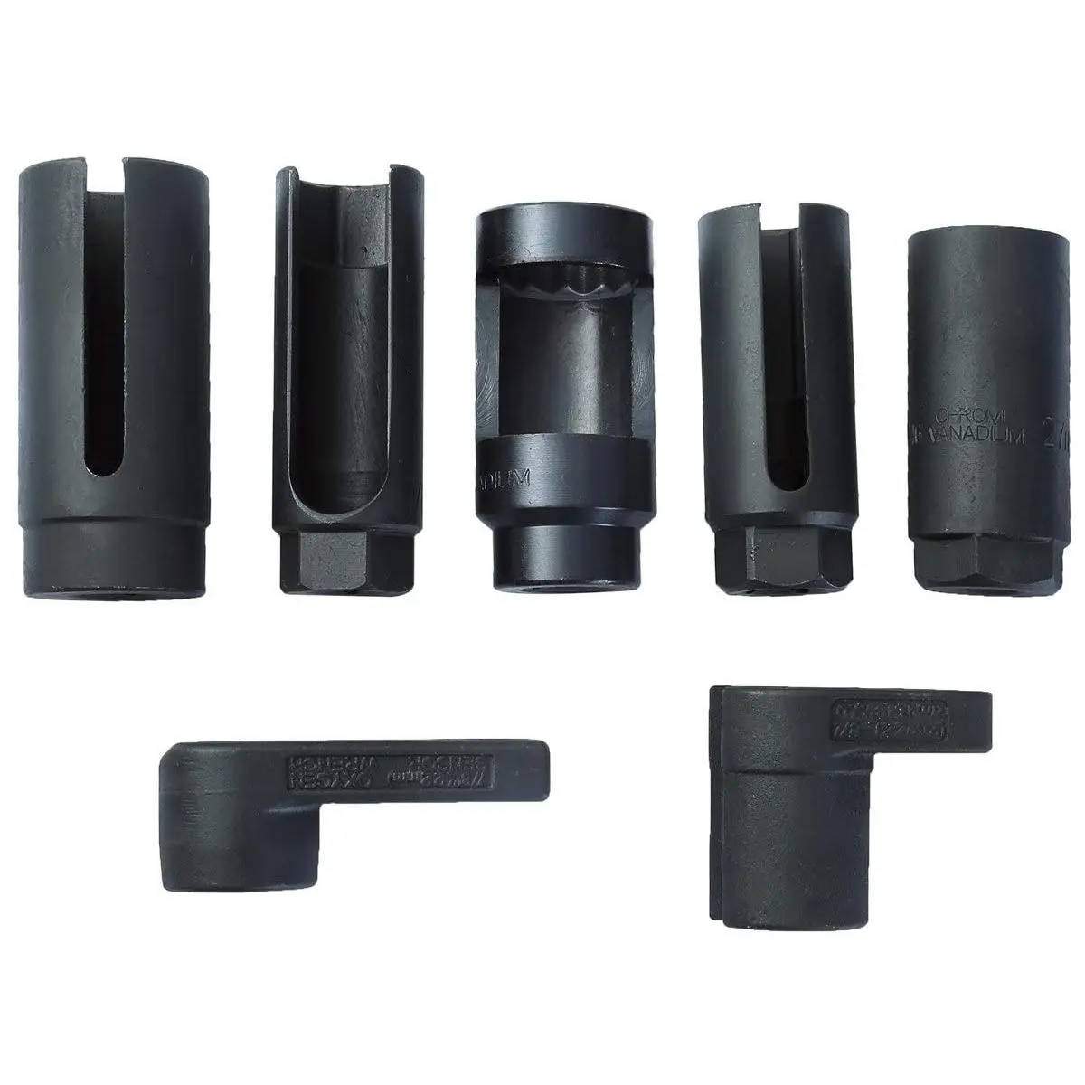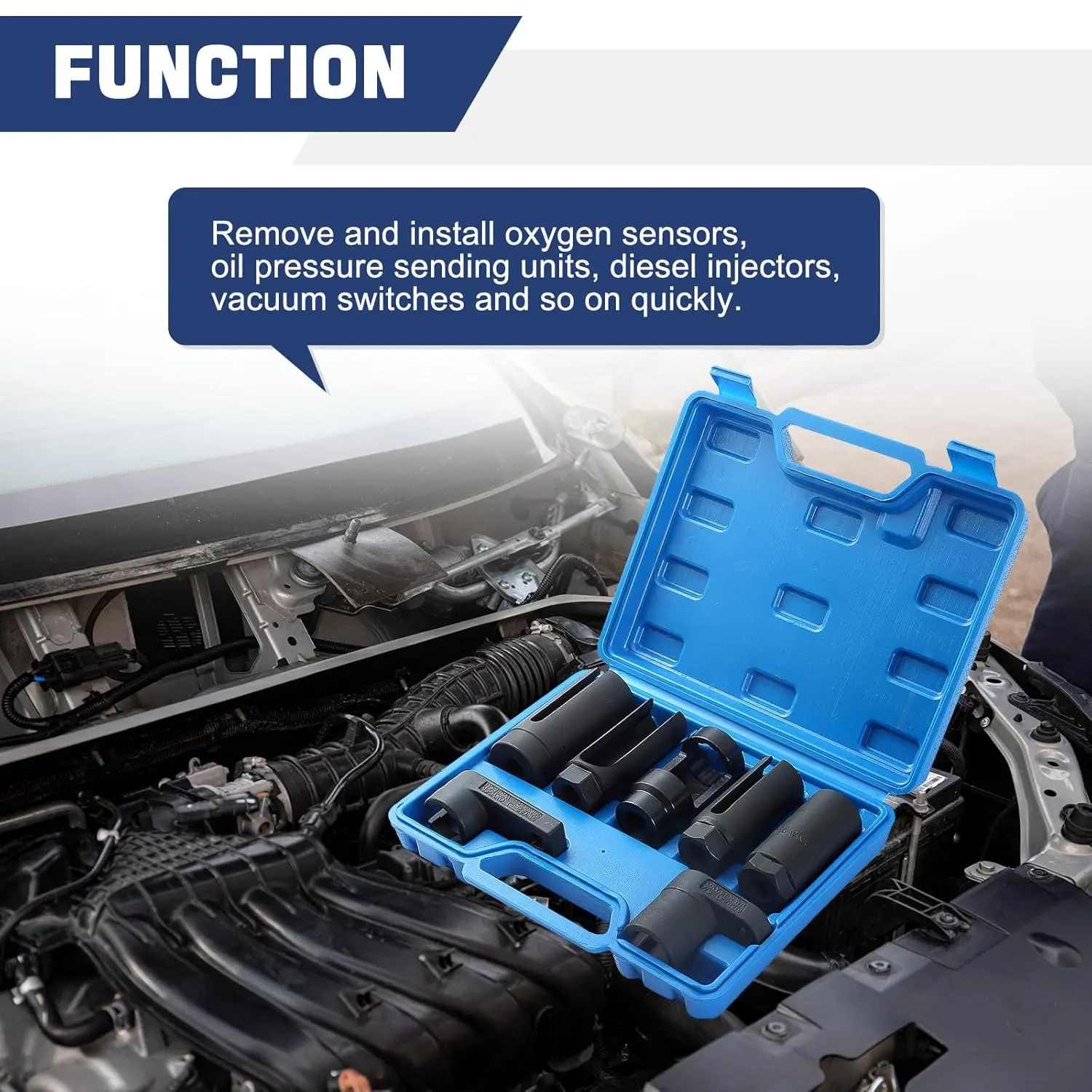 []This oxygen sensor socket set is made of high performance chrome molybdenum and solid cast steel construction for strength and durability.Black oxide coating on the surface to prevent rust and corrosion. [Design]Standard 6 point with low profile and side cutout design to enable you remove oxygen sensors with the wiring harness still attached, and the socket is offset and compact which allows extra leverage even in hard to reach spots. Large engraved sizes on each piece offer quick identification. [Easy Operation]The slotted design of the the oxygen sensor wrench allows you to remove oxygen sensors with the wiring still attached, while the offset wrenches allow for extra leverage with your breaker bar or ratchet even in hard-to-reach spotsthe precision forged slotting gives you maximum torque with minimum effort. [Wide Application]for removal and installation of oxygen sensors, oil pressure sending units, diesel injectors, vacuum switches, and thermal sensor switches. [7PCS Oil Pressure Sensor Socket Wrench Set]1" , 1-1/6", 1-3/16" Oil Pressure Sending Unit Socket1-1/16" GM Thermal Socket7/8" Short low Profile O2 Oxygen Sensor Socket7/8" Universal Oxygen Sensor Socket7/8" Universal Vacuum PVSTVS Socket Tool.