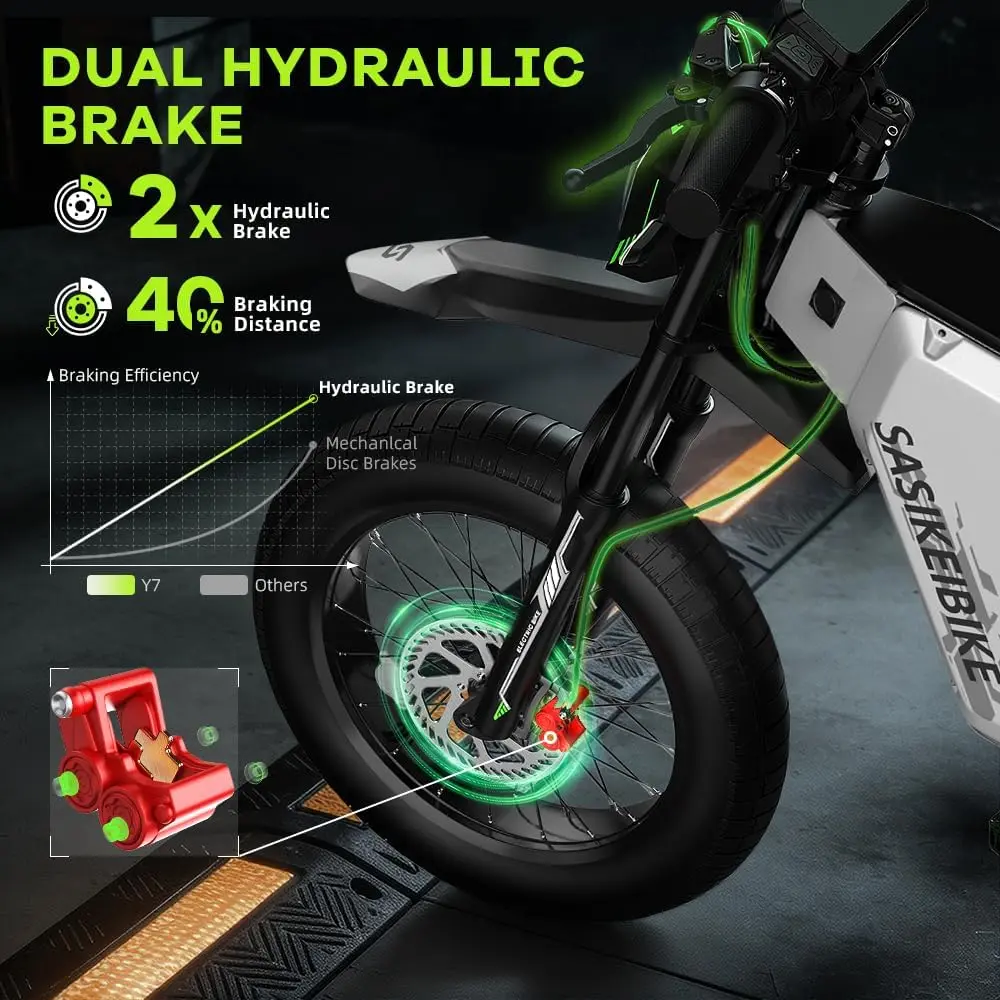 ·【High-Performance Hydraulic Brakes for Safety】Y7 Electric Dirt Bike features high-performance hydraulic brakes. This e-bike delivers smooth, responsive stopping power. 203 mm brake discs provide exceptional control. Even at high speeds, the braking distance remains short, offering added safety for riders of all skill levels.