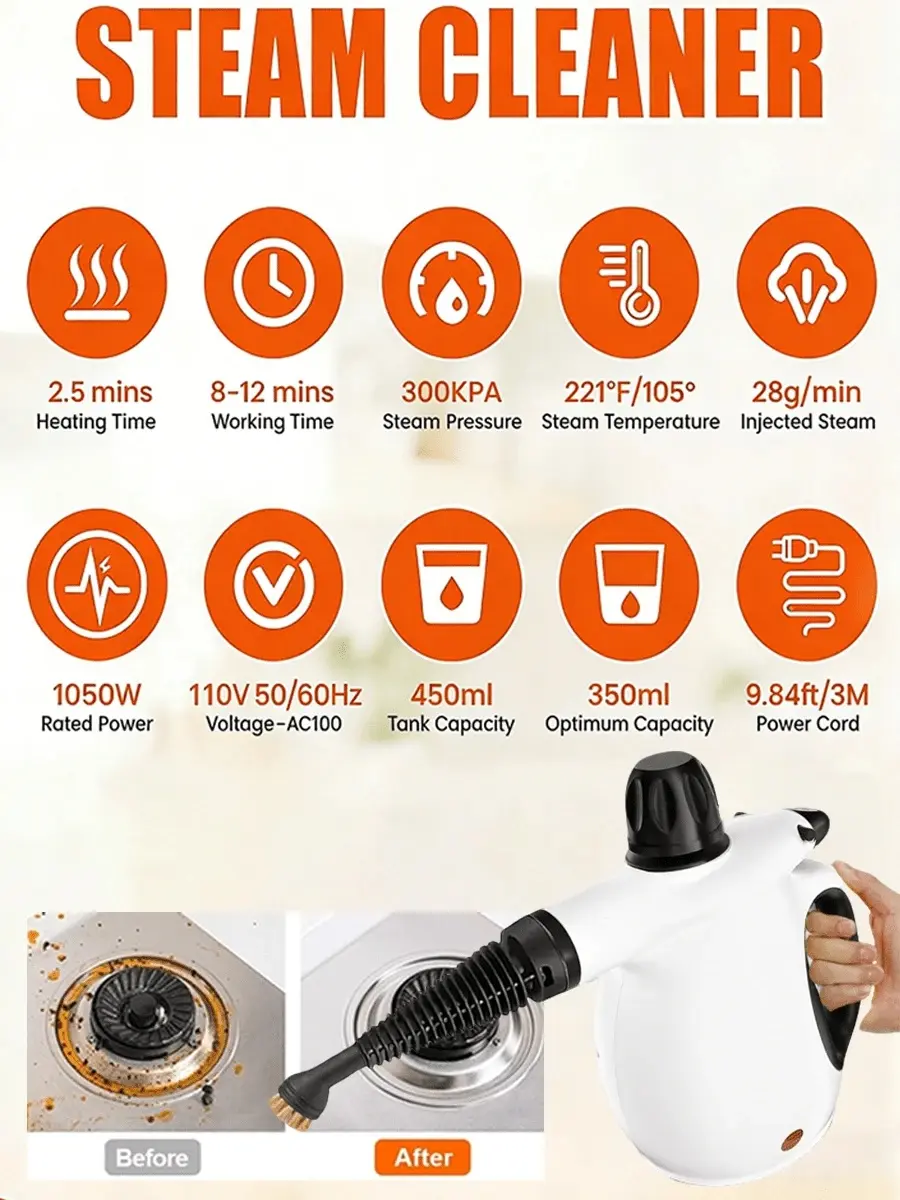 Transform your cleaning routine with our Multipurpose Handheld Pressurized Steam Cleaner! Designed for effortless and eco-friendly cleaning, this natural steam cleaner delivers 230°F (110°C) high-temperature steam to tackle dirt, grease, and grime on virtually any surface.