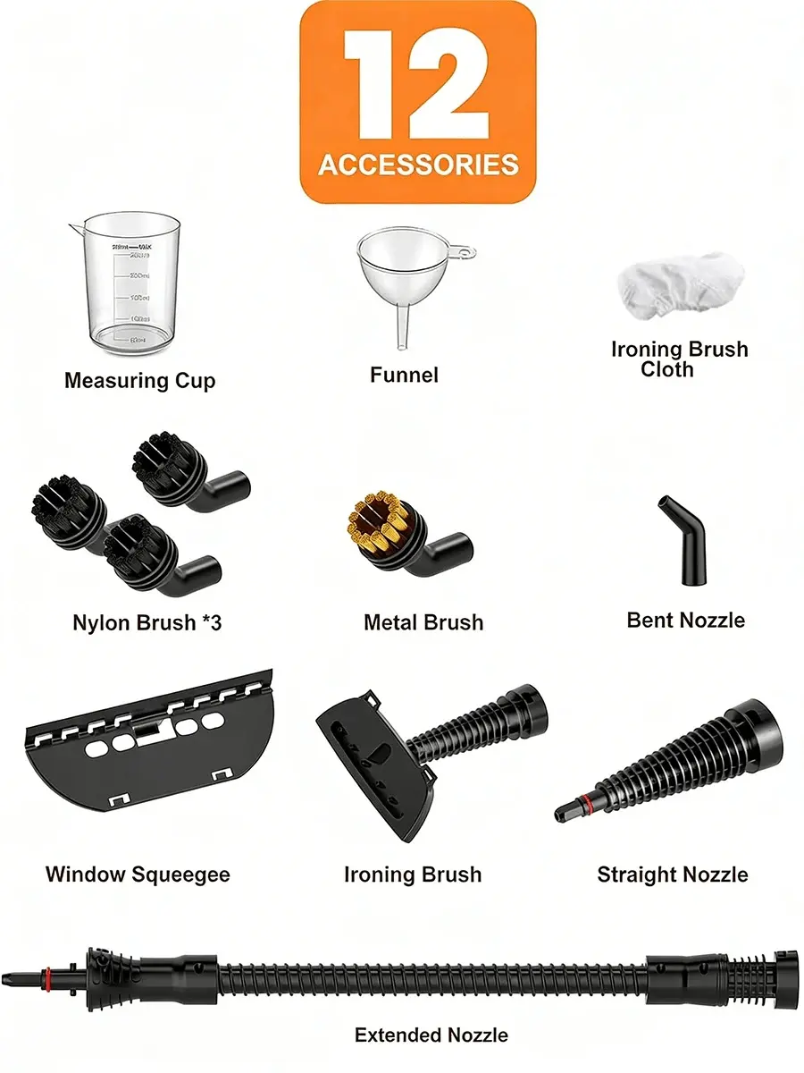From floors to furniture, our steam cleaner comes with a 12-piece accessory kit to handle any job. Whether you're cleaning tile grout, sanitizing your couch, or detailing your car, there's a tool for every surface. It's like having a professional cleaning arsenal at your fingertips!