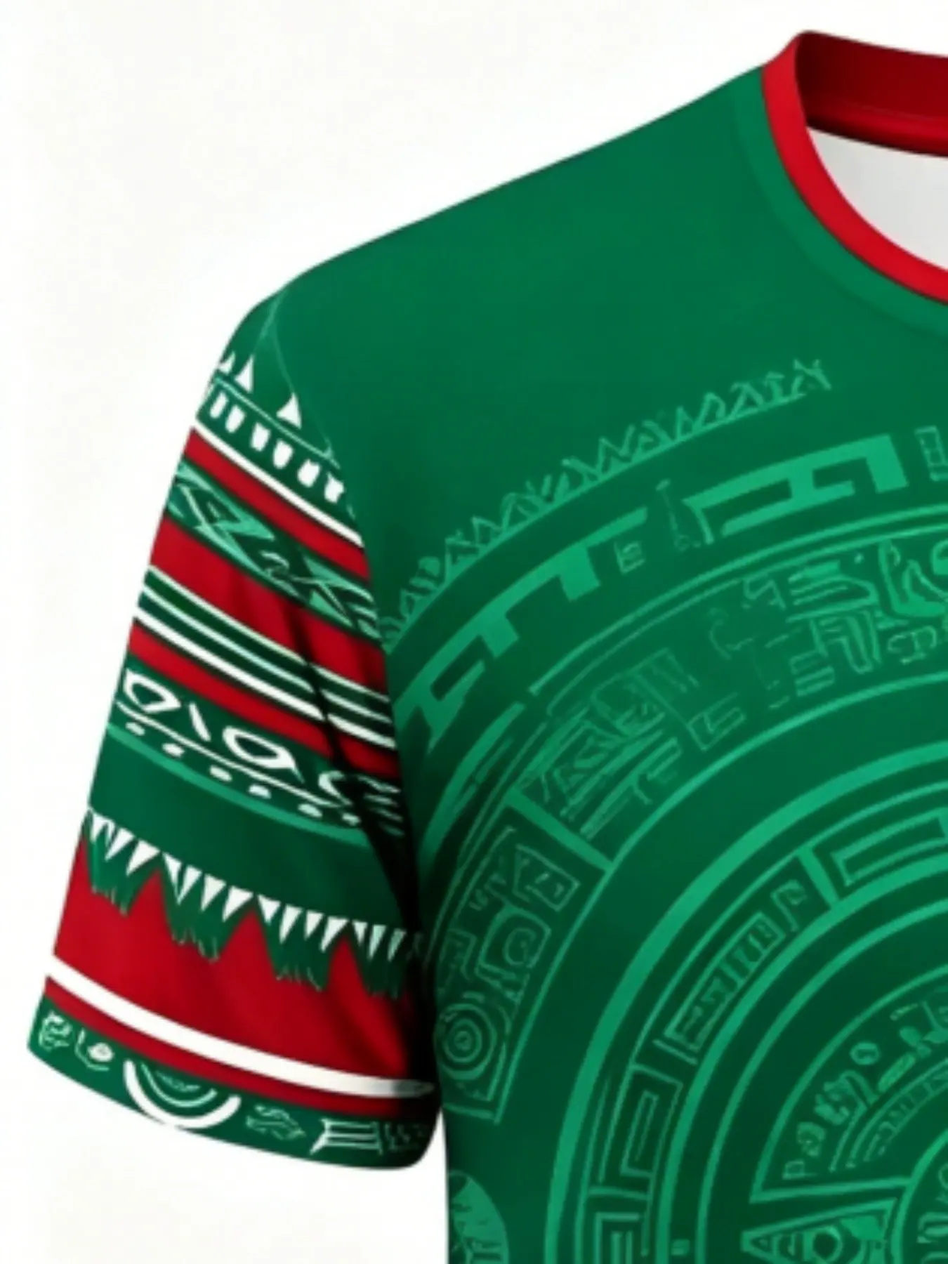 Men's Mexican Aztec Tribal Symbol Sport T-Shirt, Ethnic Street Round Neck Short Sleeve Top, Loose-Fit Geometric Pattern, All Seasons