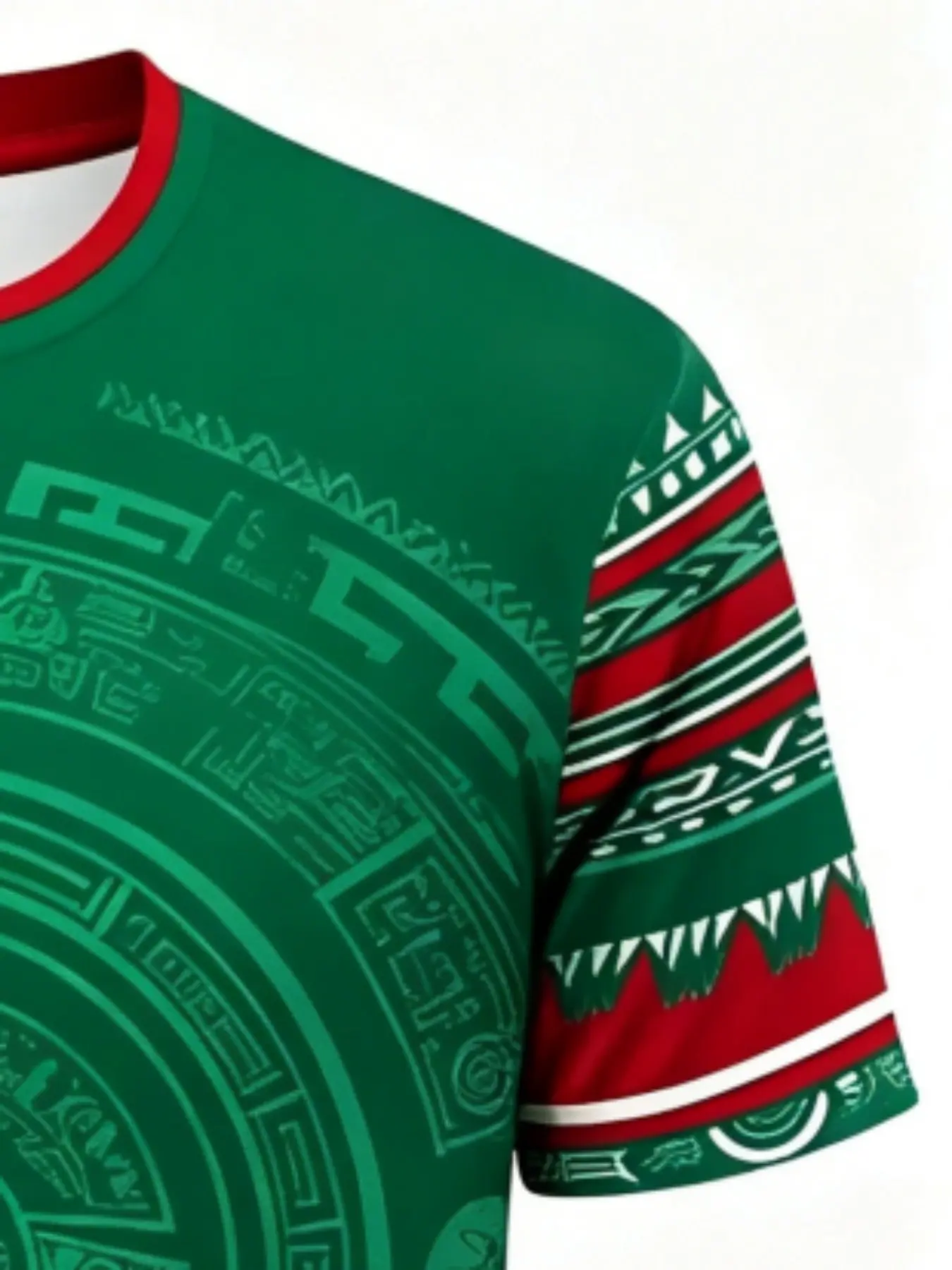 Men's Mexican Aztec Sunstone Flag Sport T-Shirt, Street Style Round Neck Short Sleeve Top, Geometric Pattern, All Seasons