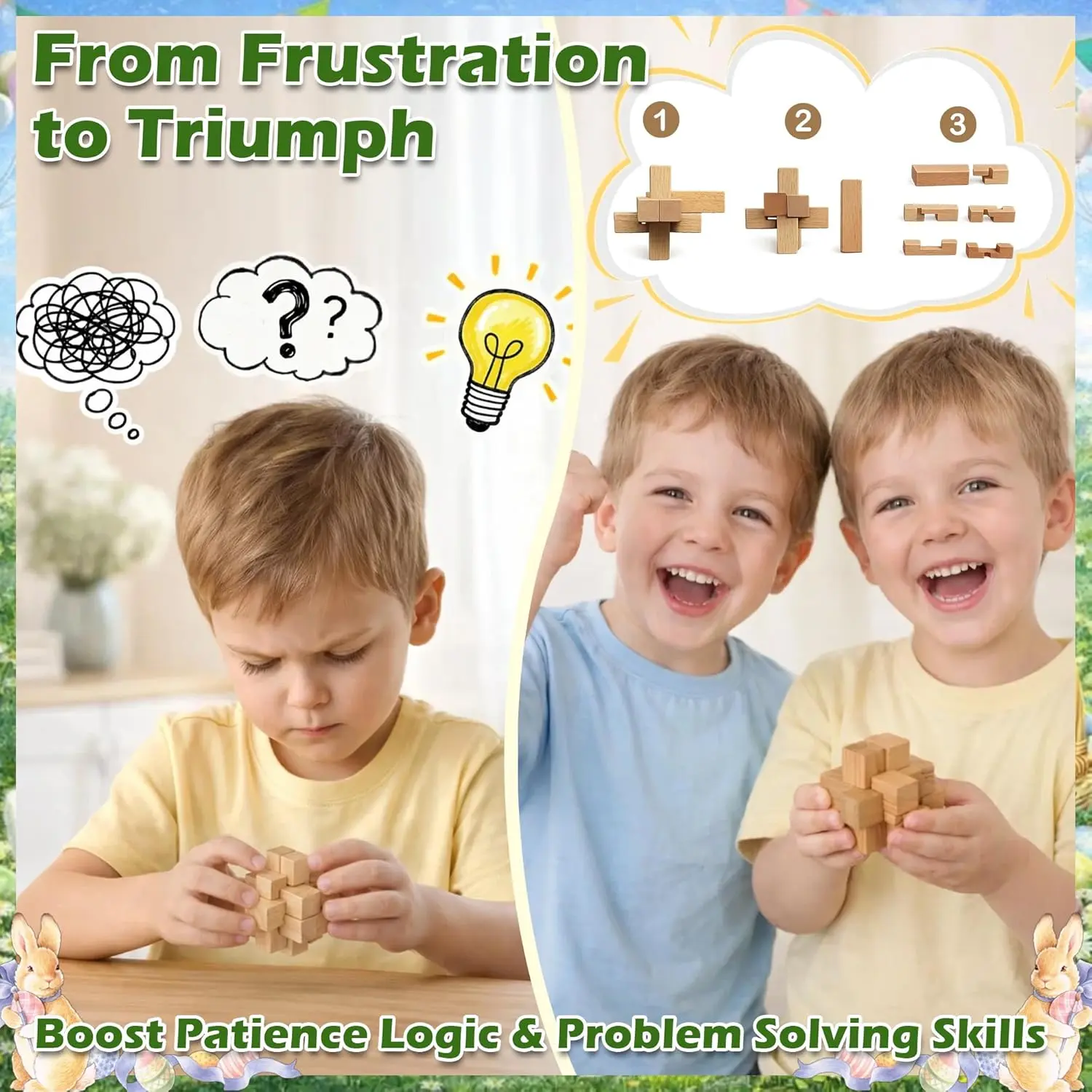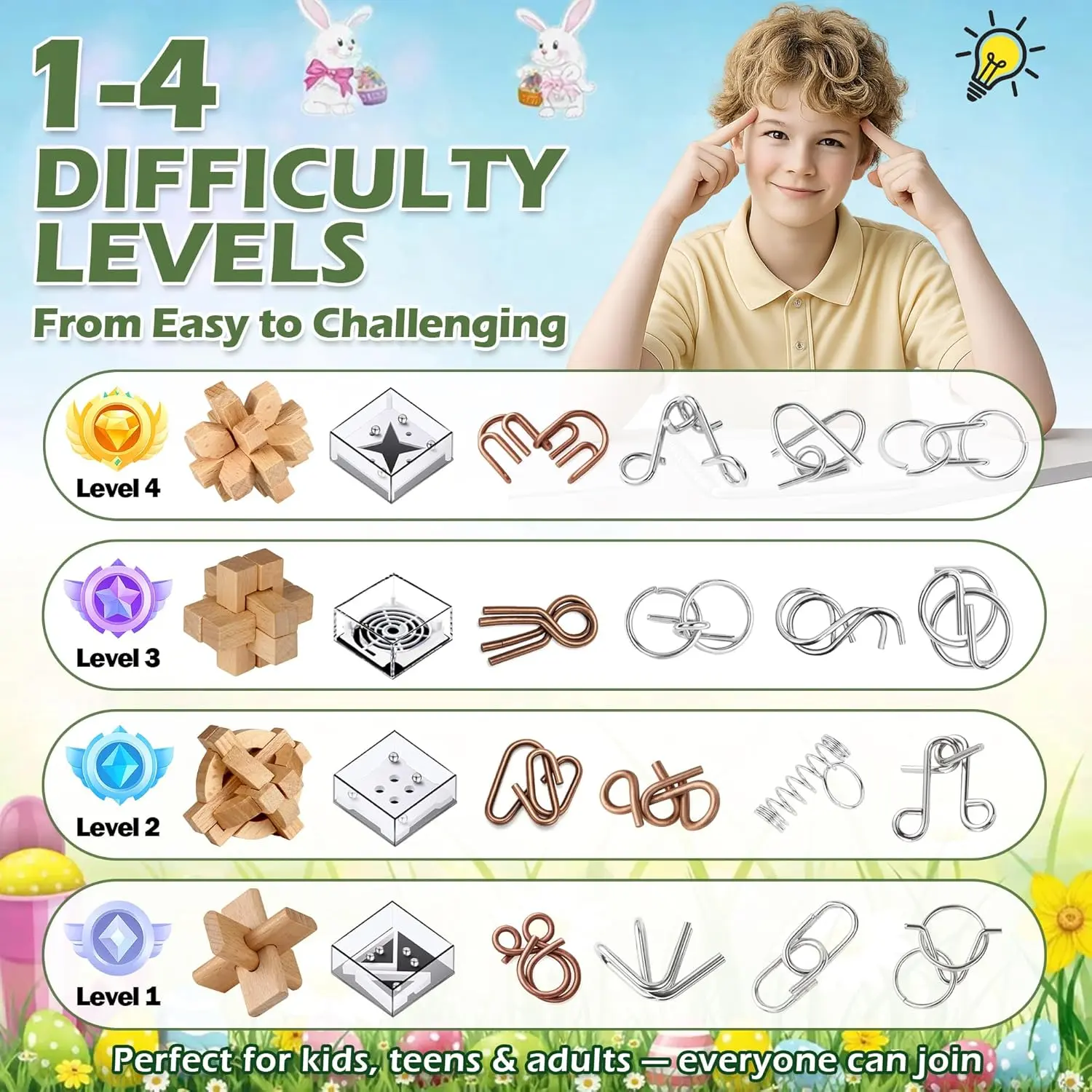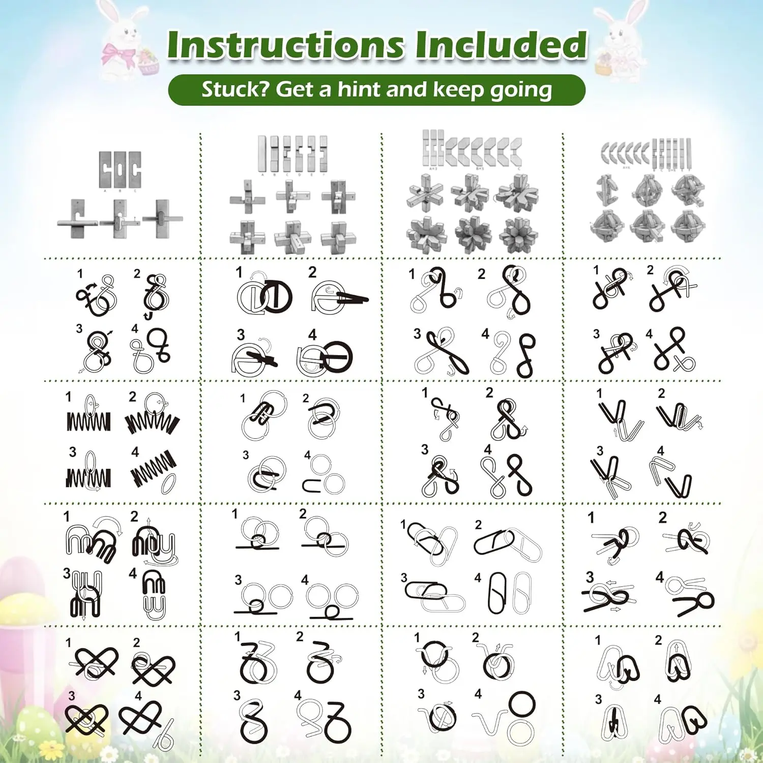·Important Note About Packaging: The outer packaging includes Easter-themed designs, but the product itself is a general-purpose brain teaser puzzle set suitable for year-round use,especially for class or family acvitities