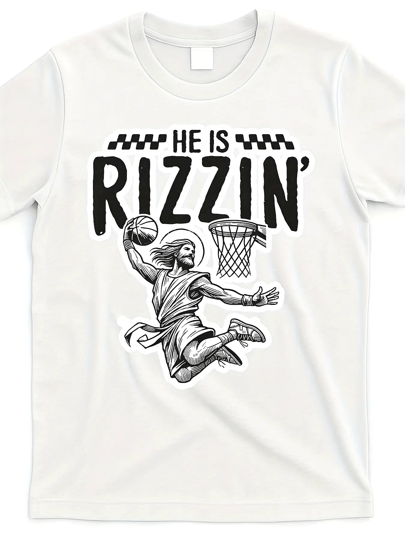 Funny He Is Rizzin' Men's T-Shirt 180g Pure Cotton Casual Jesus Basketball Graphic Print Top Gen Z Slang Meme Tee Gift for Guys S-5XL