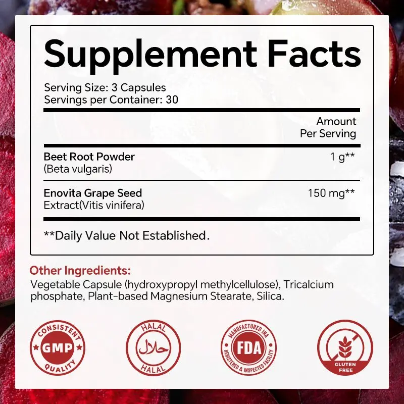 Beet Root Capsules: 1000mg Beet Root + 150mg Grape Seed Extract